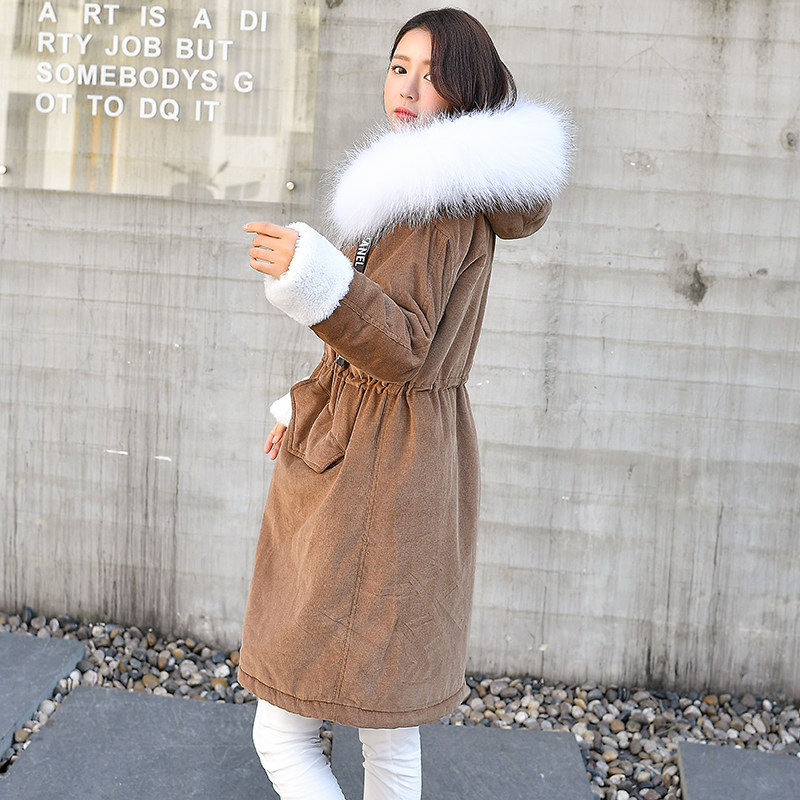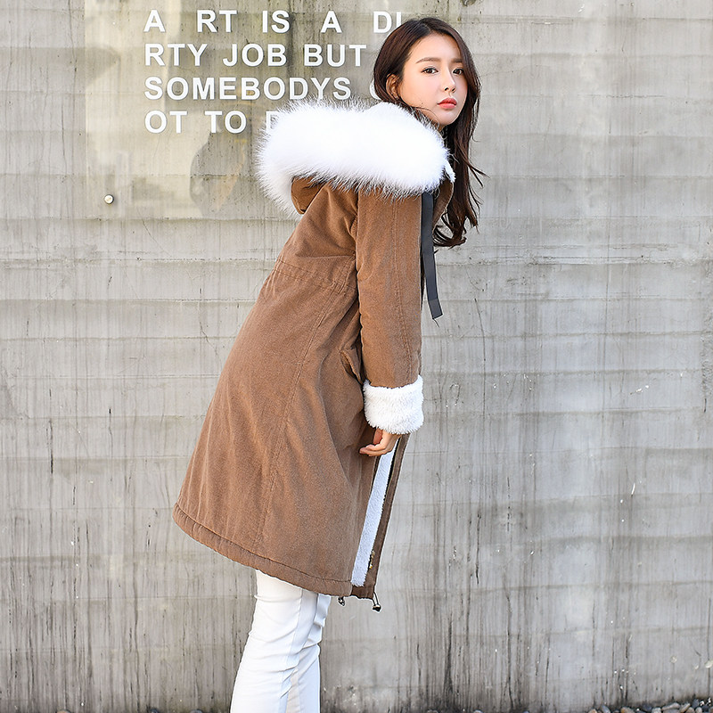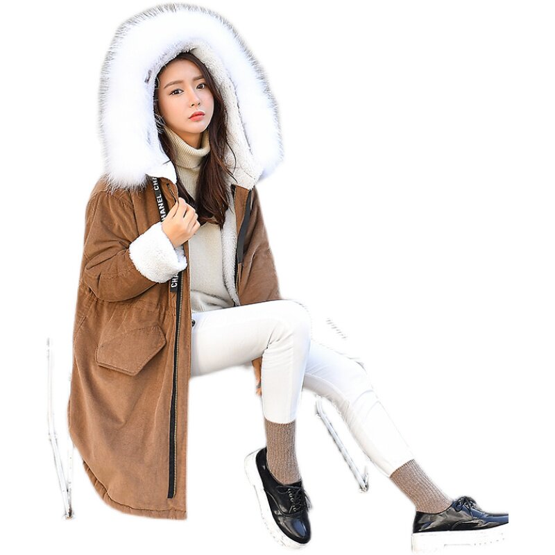 Corduroy mid-length plus velvet jacket women lamb wool thick warm Korean big fur collar padded coat hooded coat trendy