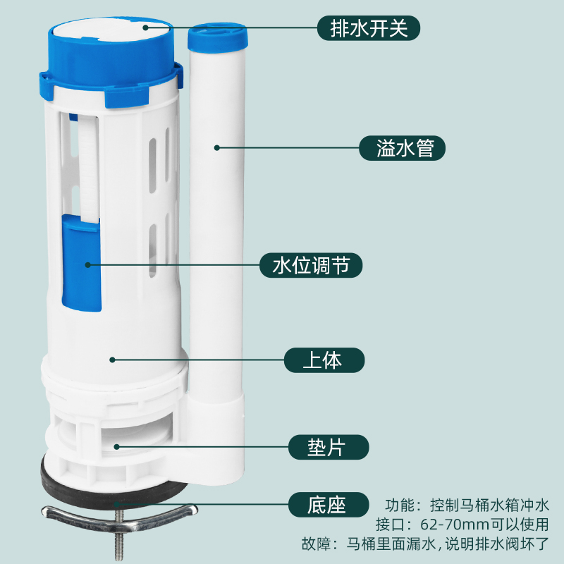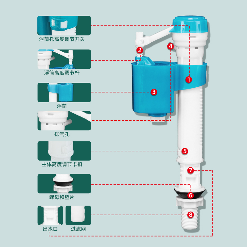 High configuration water inlet valve (universal type) High configuration extended water inlet valve Blue classic water inlet valve Low pressure water inlet valve 18cm drain valve Applicable to water tank 18~21cm 20cm drain valve