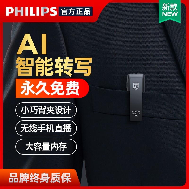 Philips Recording Pen VTR5102 Professional High-definition Noise Reduction AI Intelligent Small Carry-on Super Long Standby Recorder for students with conference recording pen sound to Chinese characters translation theorist