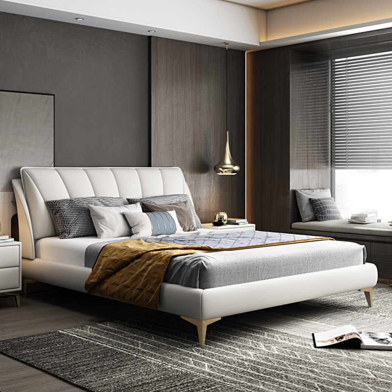 Chinese style Italian light luxury leather bed modern minimalist master bedroom 1 8 meters minimalist double bed wedding bed soft foreskin bed 1 5