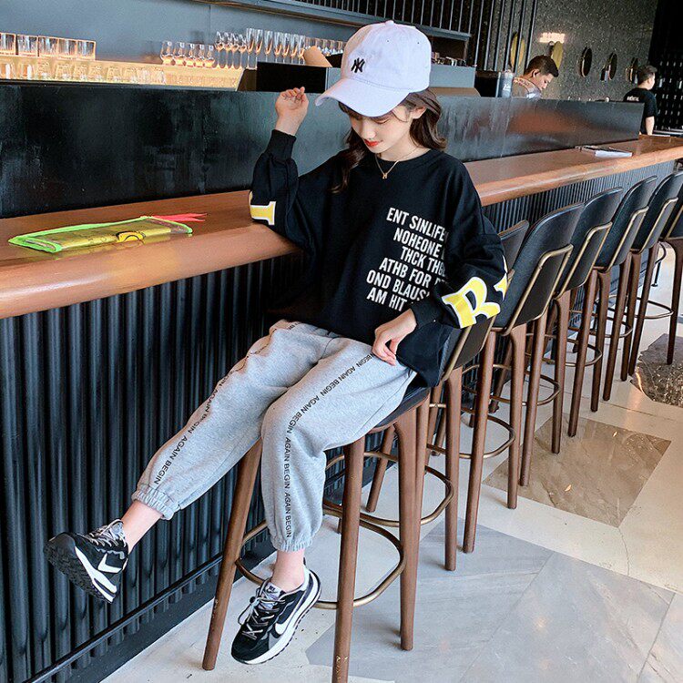 Girls 2021 autumn Korean version of long sleeve knit printing thick cotton T set foreign style children's casual pants two-piece set