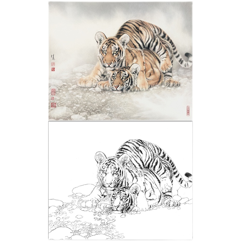 Meticulous painting line drawing draft double Tiger Liu Jibiao Chinese Painting with rice paper copying material physical printing line draft A634