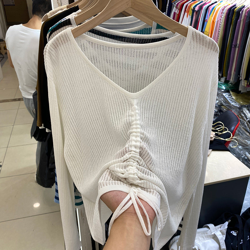Eurodesign Sense Pumping Rope V Collar Loose Stripe Long Sleeve T-shirt Woman 2021 Early autumn new thin knit hood blouse