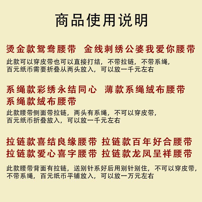 A82-(one piece) gold-stamped mandarin duck belt A88-(one piece) gold thread embroidered in-laws I love you T68-(one piece) tie rope color embroidery eternal knot concentric I12-(one piece) thin style