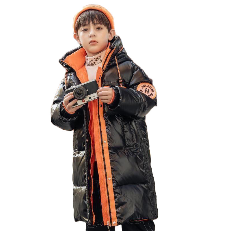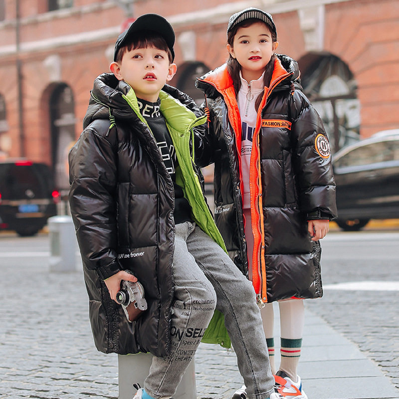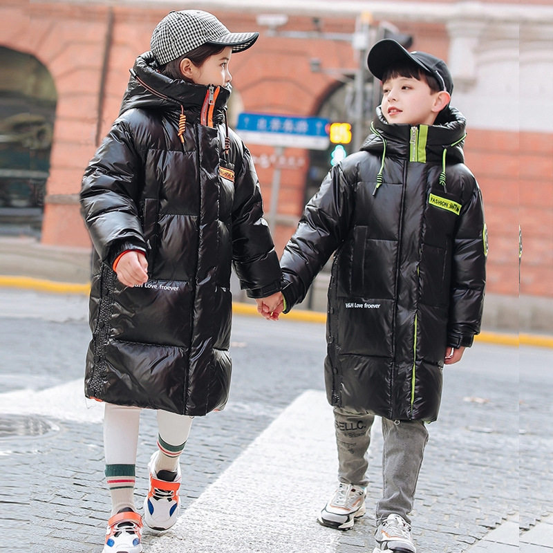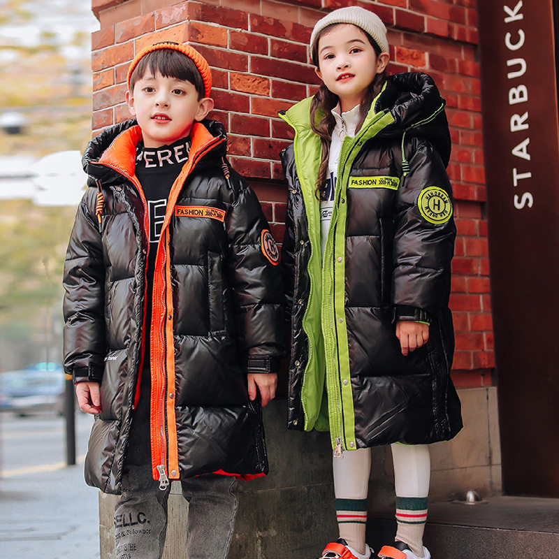 Boys and girls long version glossy wash-free down jacket thickened green orange black coat big children hooded cotton jacket clothes winter - Taobao