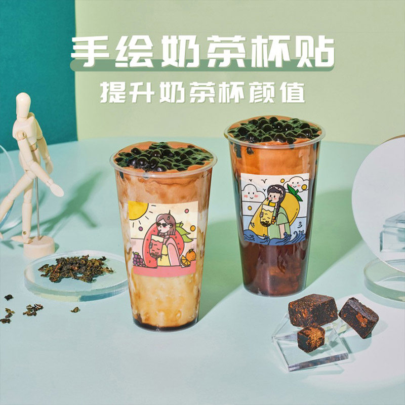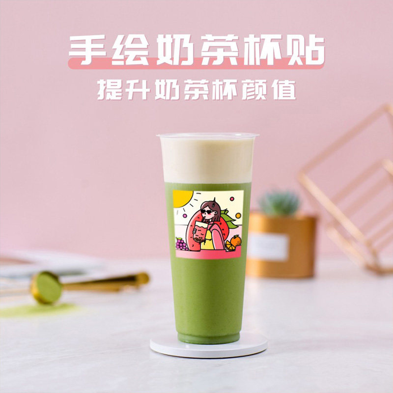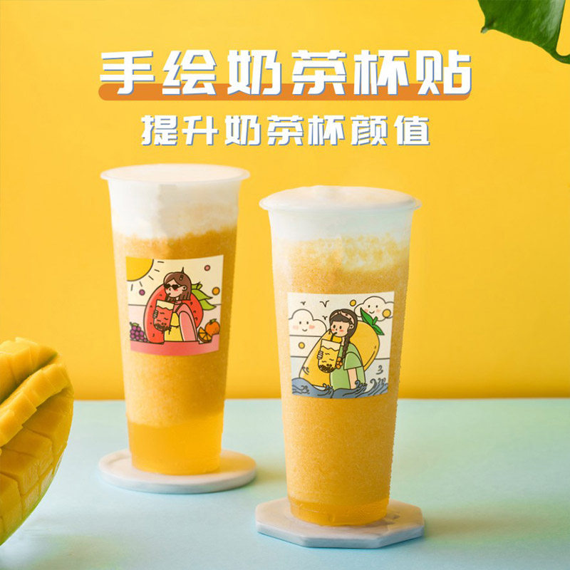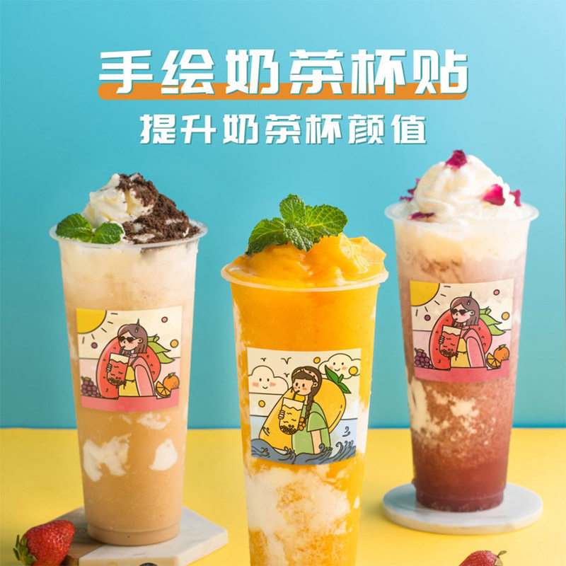 Net Red Milk Tea Cup Stickers Handbill Decoration Individuality Adhesive Custom Waterproof Cartoon Dessert Baking Cake INS Wind Cute Square Summer Limited Creative Water Fruit Tea Drink Cup Stickler