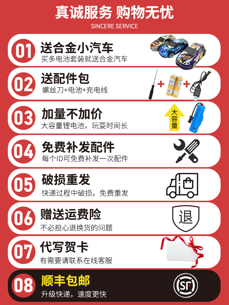 Single battery can play for 45 minutes, send alloy car, lifetime warranty, remote control battery, freight insurance, double battery can play for 90 minutes, send alloy car, lifetime warranty, remote control battery, freight insurance, three battery can play