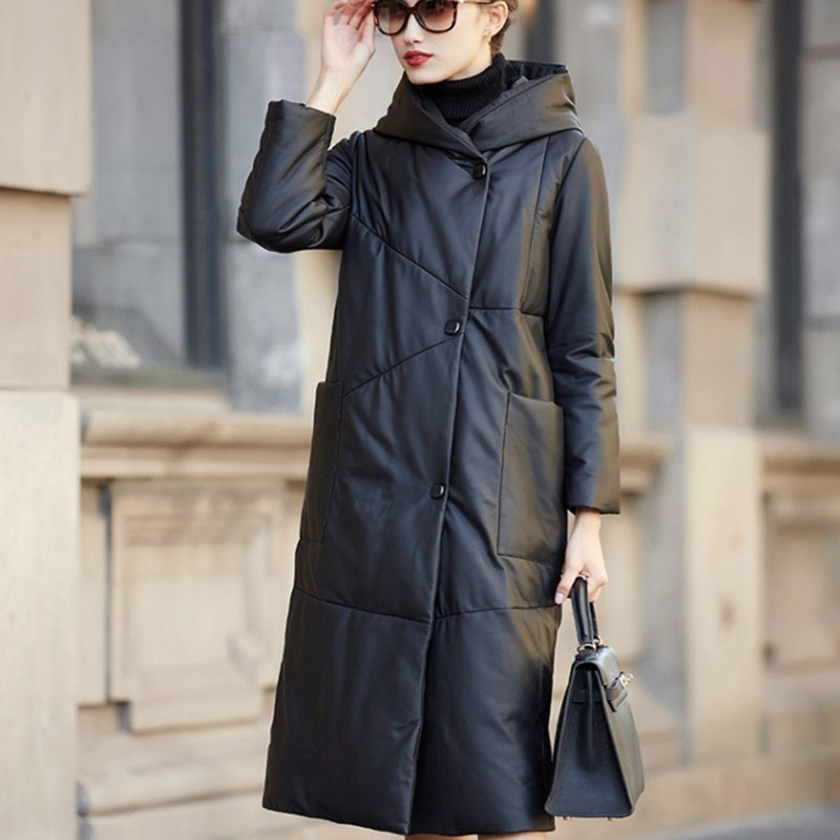Henning Head Layer Sheep Leather Real Leather Long down jacket Jacket Woman 2023 Winter New Lianhood Leisure Straight Leather Clothes-Taobao