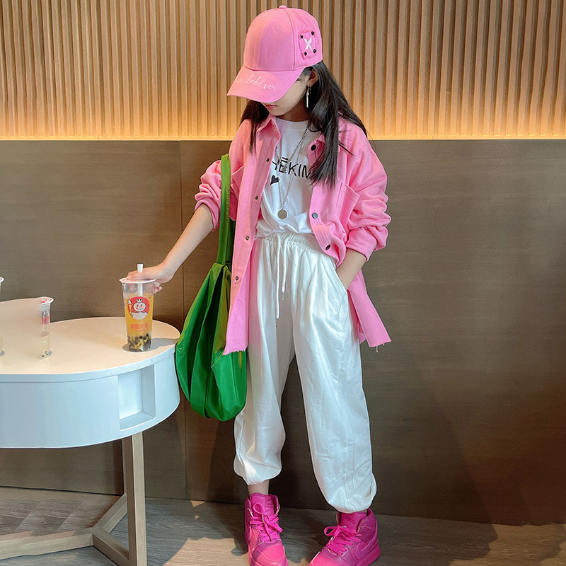 Girl Fashion Pink Jacket Foreign Pie 2021 Autumn Winter Flip Collar Long Sleeve Pocket Grab Suede Blouse Han Edition Children's Shirt