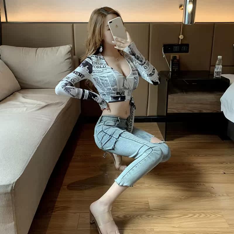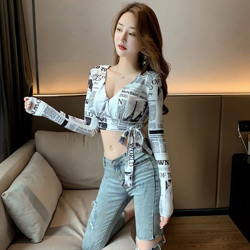 Vanya v-tapped a blouse female spring and autumn sexy sleeve design for a small-crowd low-collar newspaper printed tops