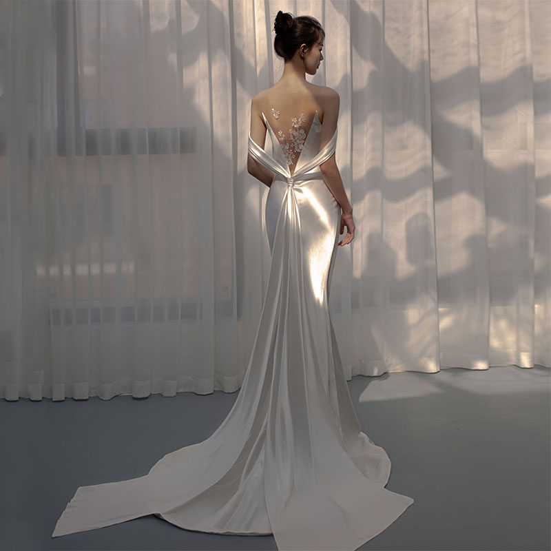 Korean-style mermaid light wedding dress sexy beautiful back bride trailing outdoor go-out gauze white simple satin evening dress autumn