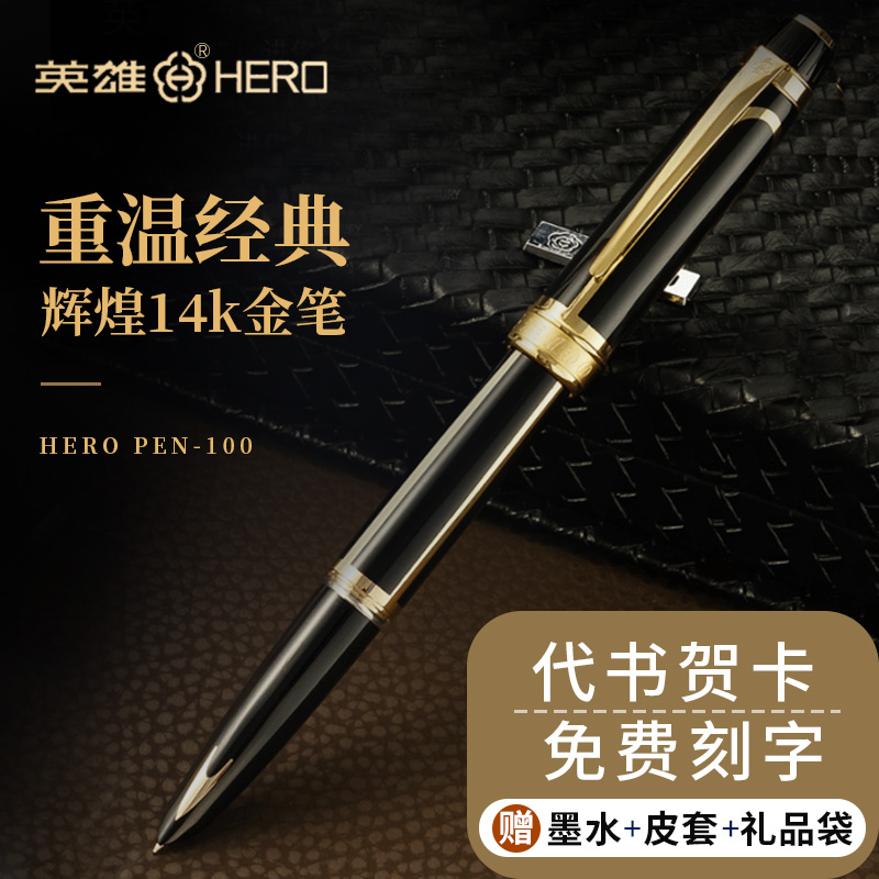 Hero Brilliant 100 fountain pen 14K gold pen official adult business male hard pen calligraphy practice pen high-end gift box old-fashioned classic dark tip gold pen custom lettering gold list title
