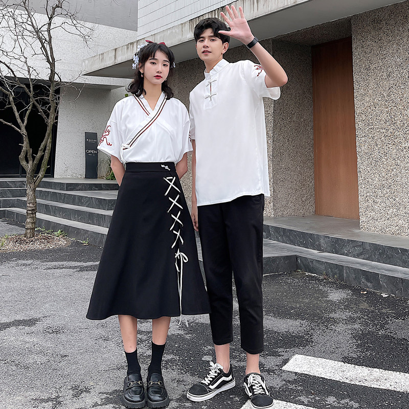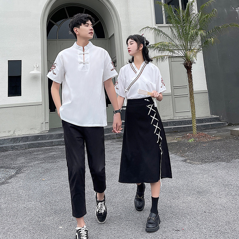Men's white T-shirt Women's white T-shirt Women's black skirt Men's black pants Women's white T-shirt Women's black skirt (two-piece) Men's white T-shirt Men's black pants (two-piece set)