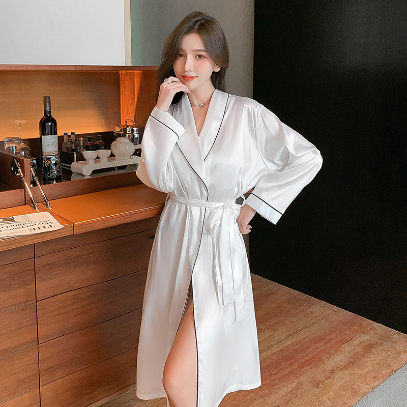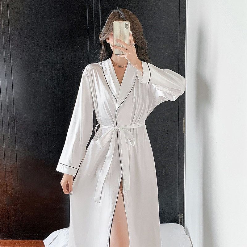 Spring and autumn sexy white ice silk nightdress hotel net red long-sleeved nightgown boyfriend style simple ins pajamas home service