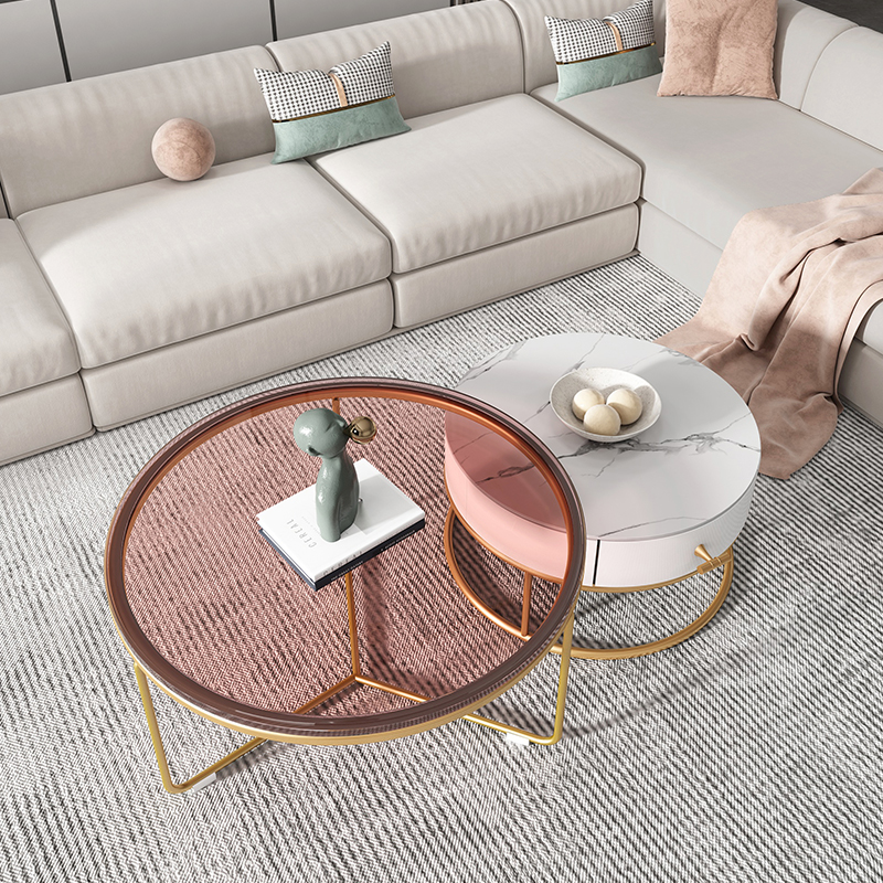 Light extravagant primary-secondary tea table combination minimalist modern rock plate tea table extremely simple office tempered glass iron art round tea table
