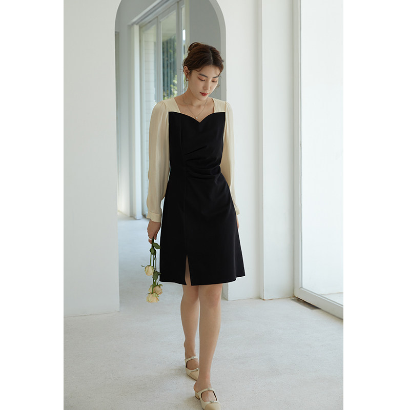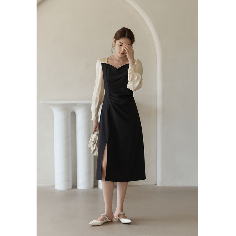 Single bunch size dress women autumn and winter 2021 New slim long sleeve square collar slightly fat mm retro dress mosaic long skirt