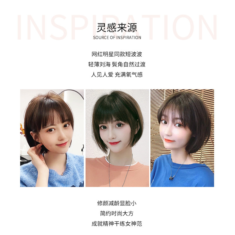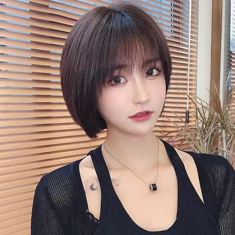Wig Woman Summer Short Hair Sweetness Mesh Red Round Face Bobo Head Real Hair Bald Skinhead Full Head Wig Sleeve