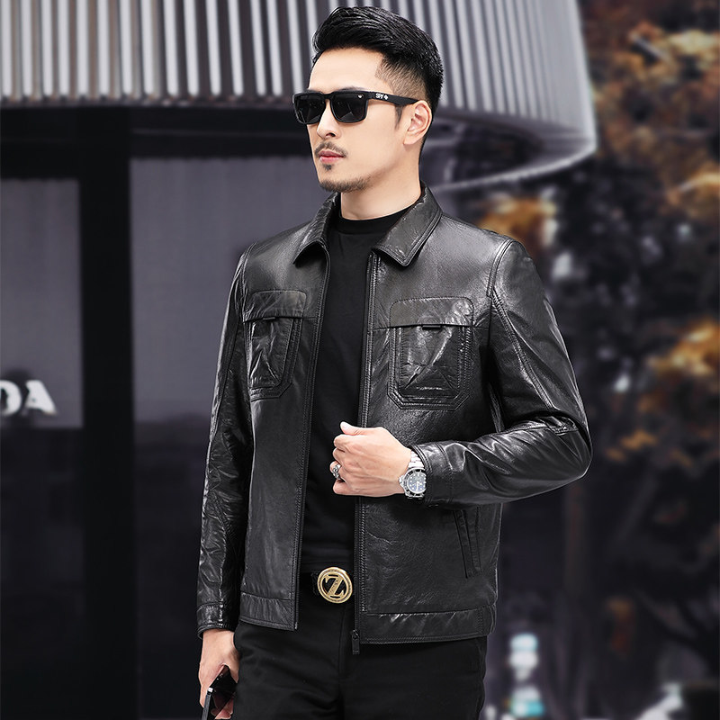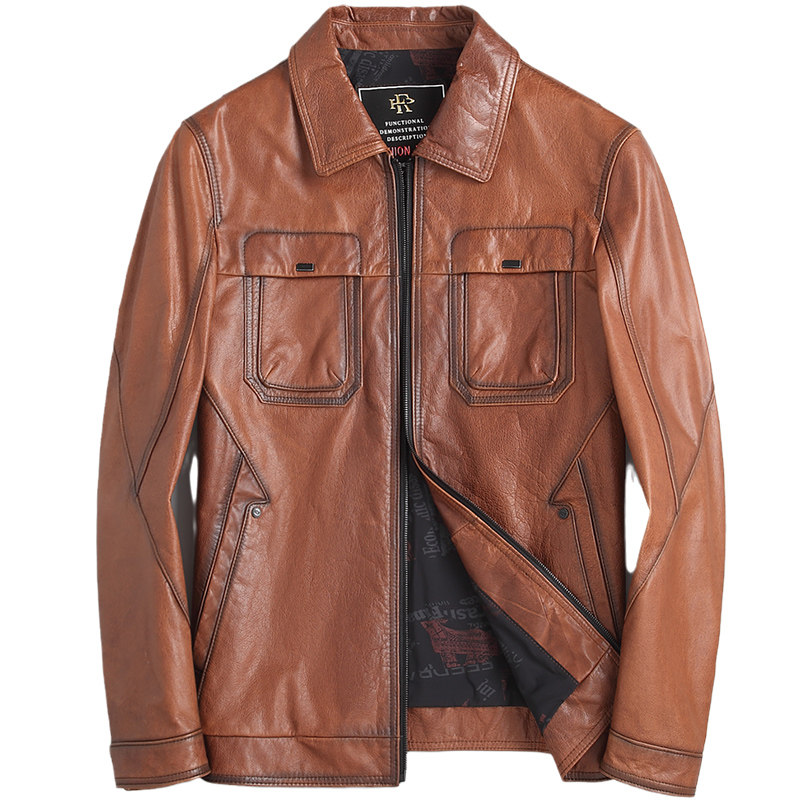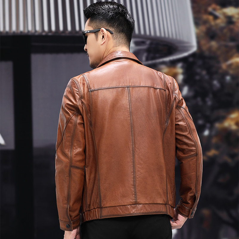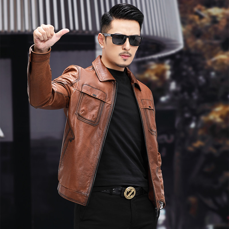 Haining's new leather jacket men's head layer waxed calfskin jacket slim fit lapel short trendy jacket 2021