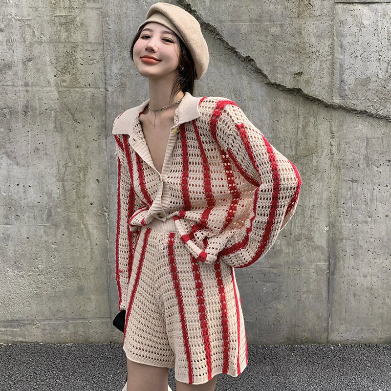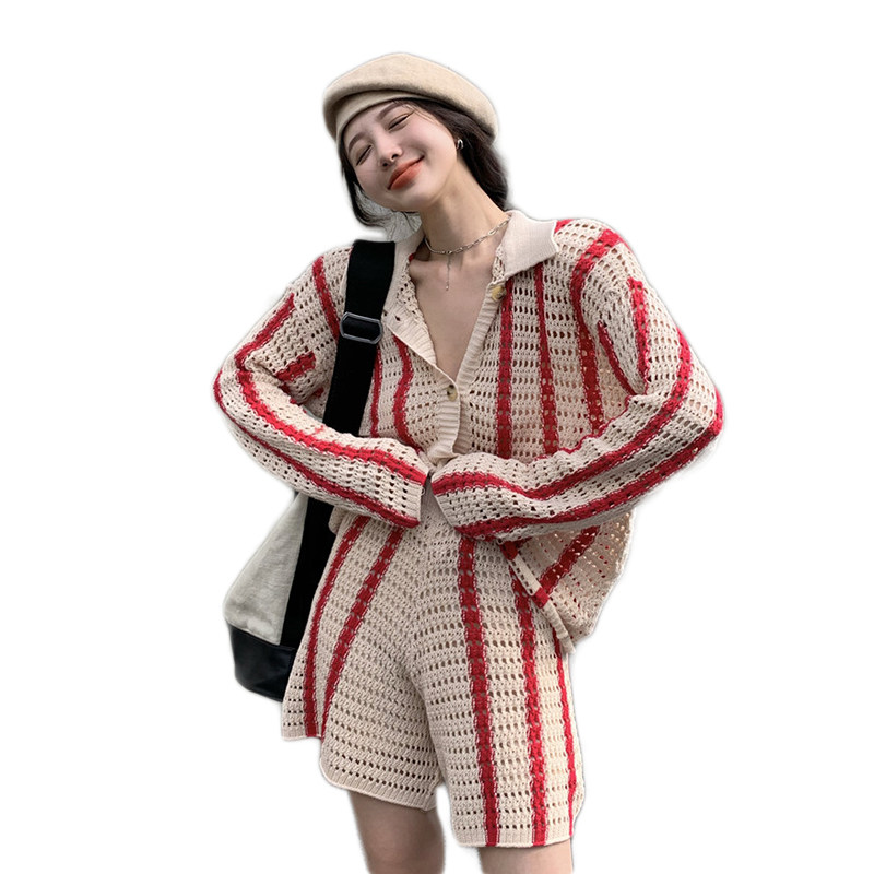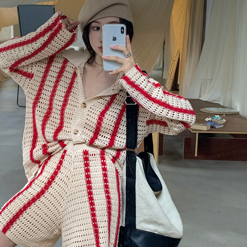 Port Wind Suit Women Retro Chic Hollowed-out Striped Casual Foreign Pie LAZY WIND KNIT TWO SETS 2021 FALL TIDE