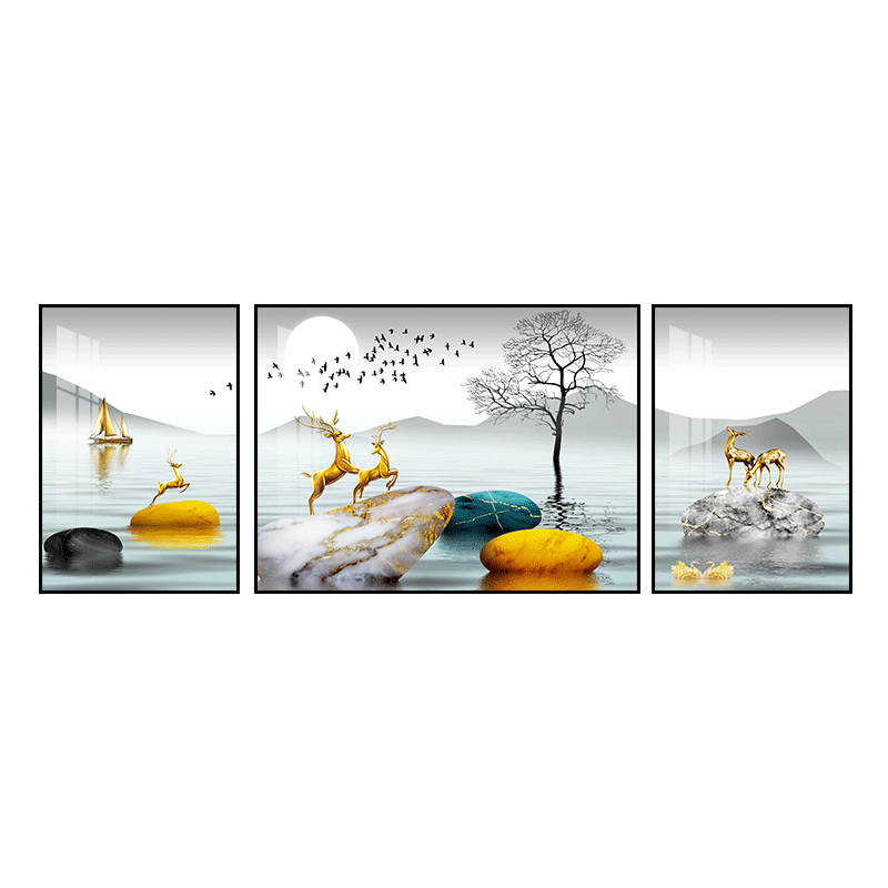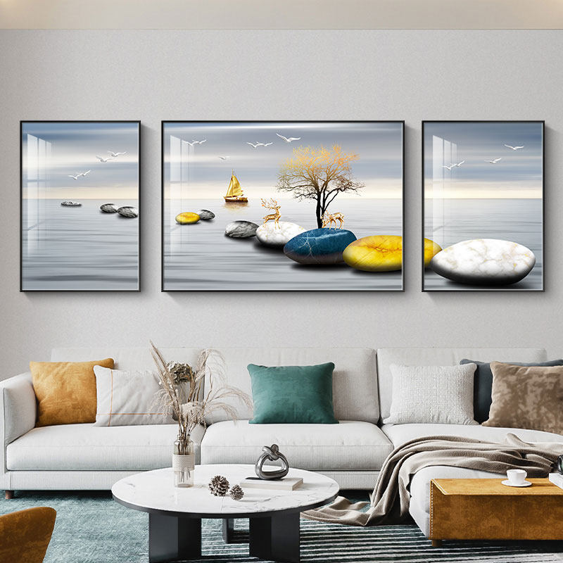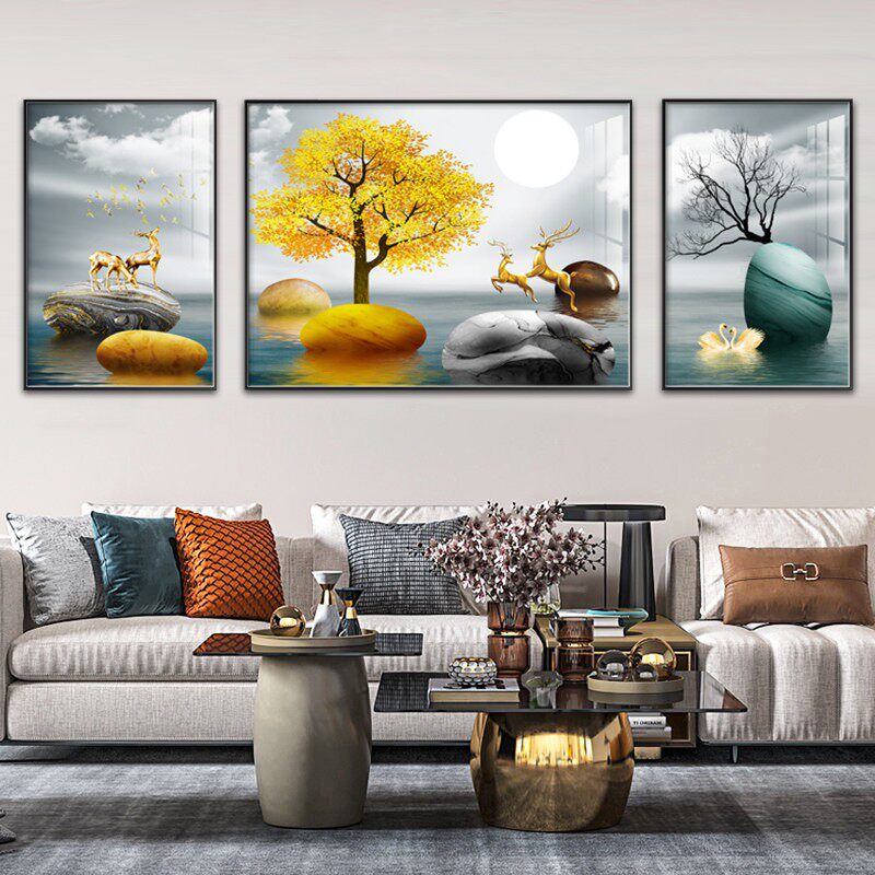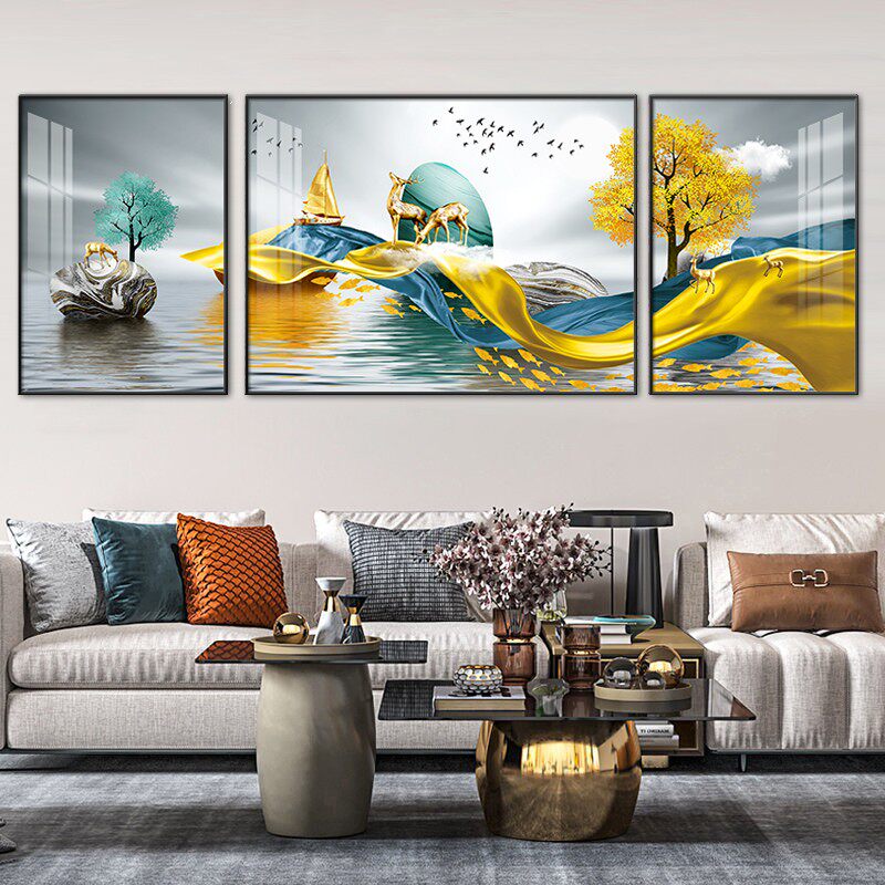 Modern Minimalist Living-room Decoration Painting Triple Hang Painting Light Lavish Grey Sofa Background Wall Nordic Crystal Porcelain Inlaid Drilling Mural
