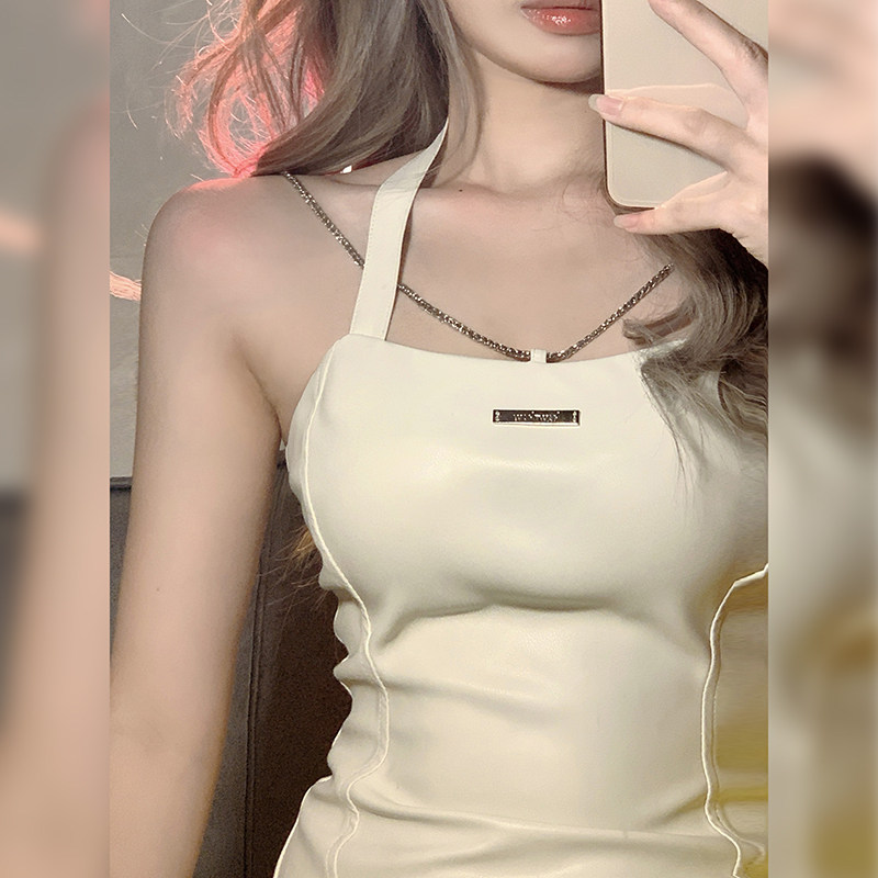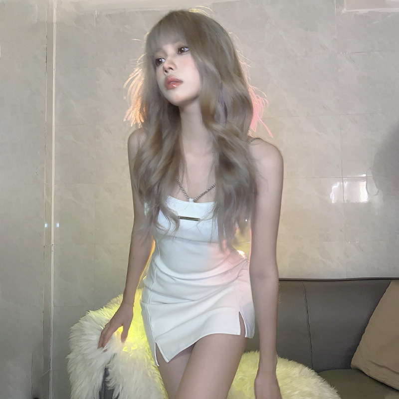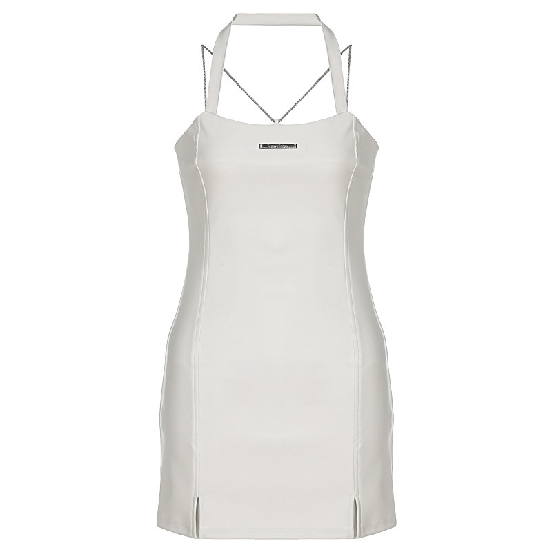 Pure desire to wind white cortex hanging neck one-piece dress 2023 Summer new millennial hot girl Heavy workpack hip open fork short skirt-Taobao