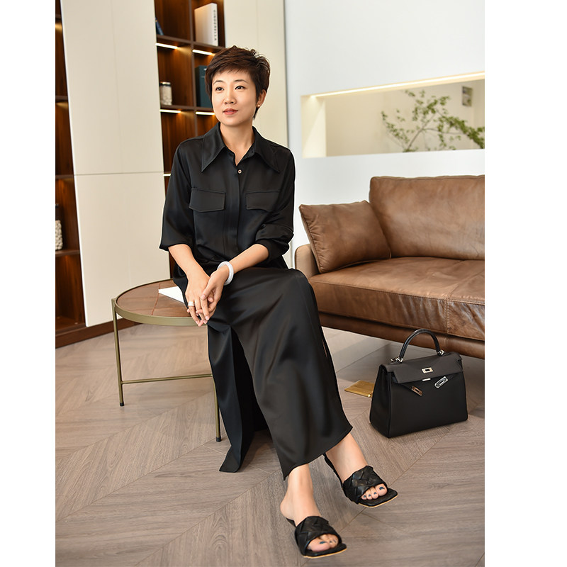 The small crowd to customize the heavy-pound acetate fabric for self-wearing, and Xu Qiuqiu long dress shirt-style foreign dress