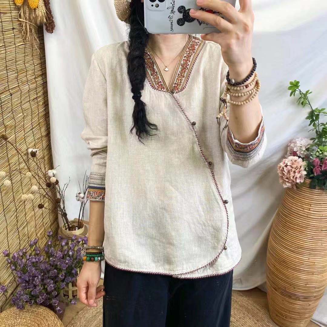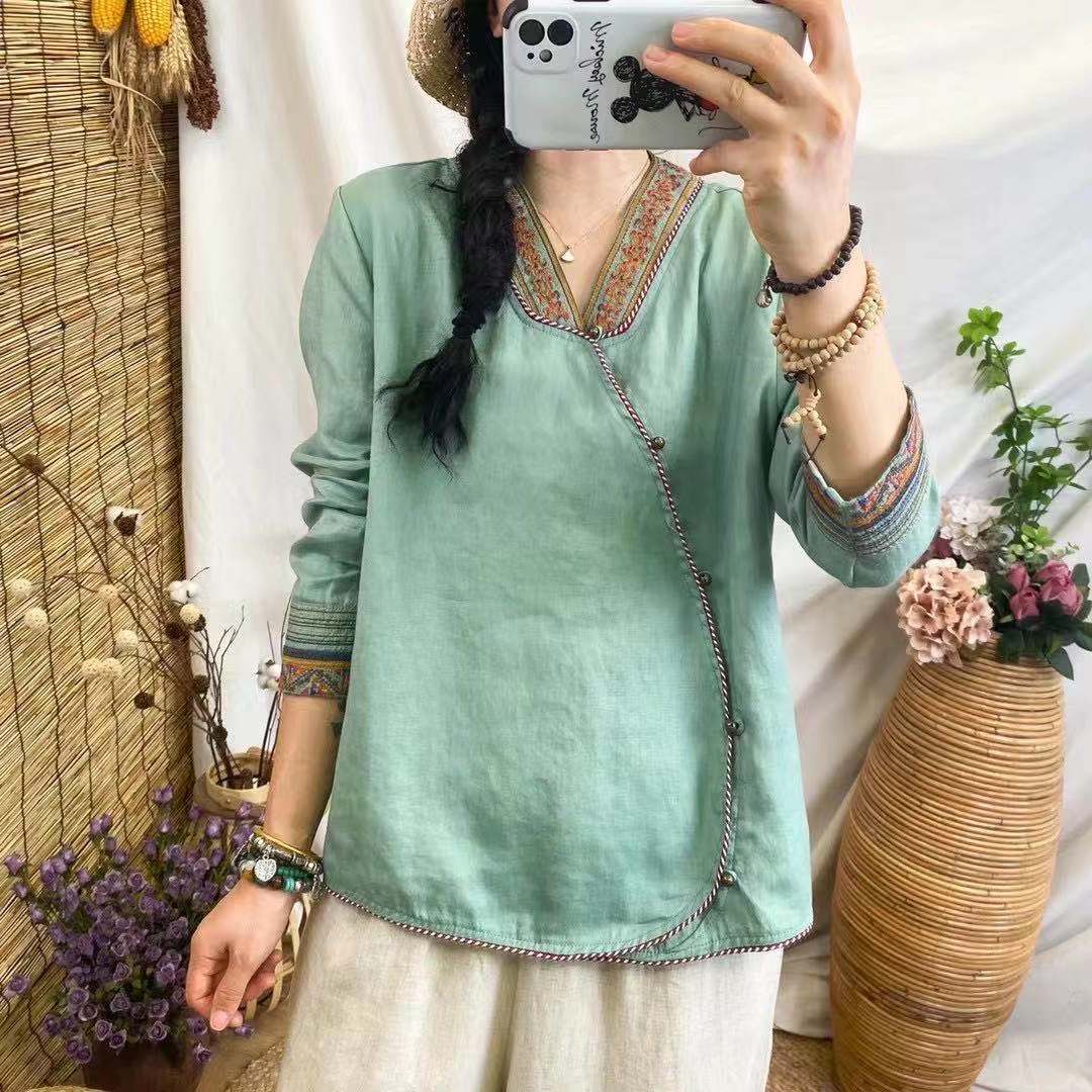 2021 pure linen long sleeve jacket full-pack edge V collar embroidered shirt loose large size slim bronze bell button 4 blouse