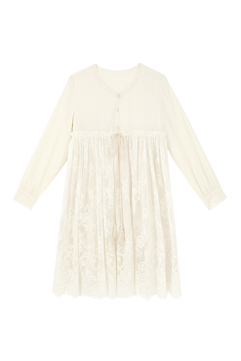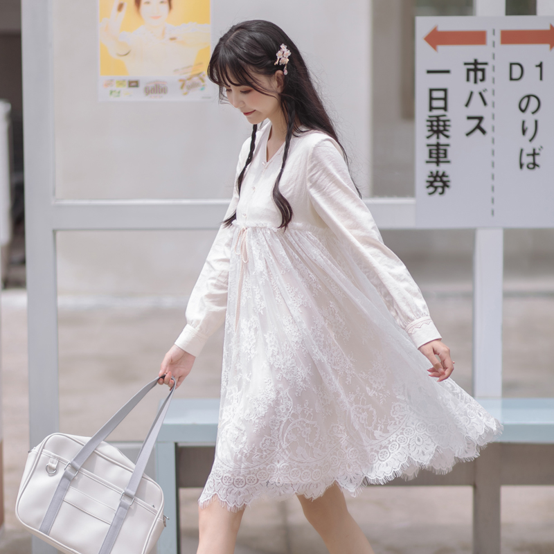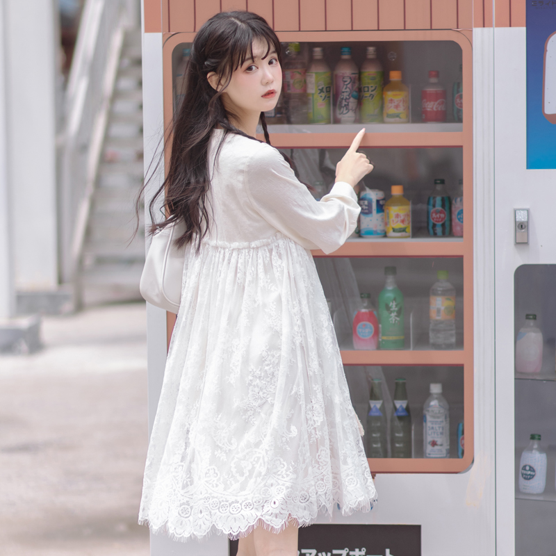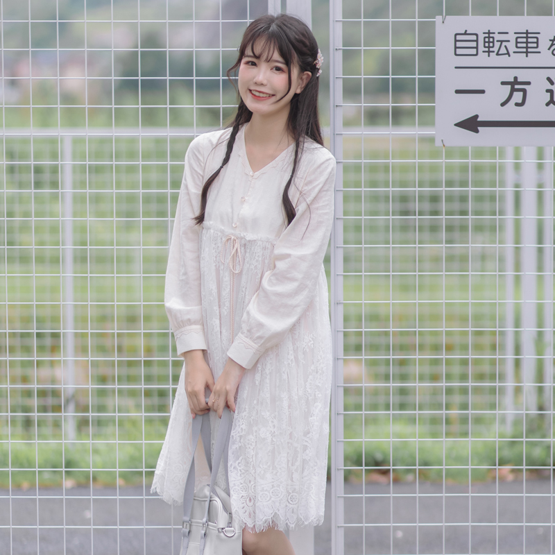 Chuandai time: Angelica original design Mori national style lace dress early autumn long-sleeved mid-length skirt