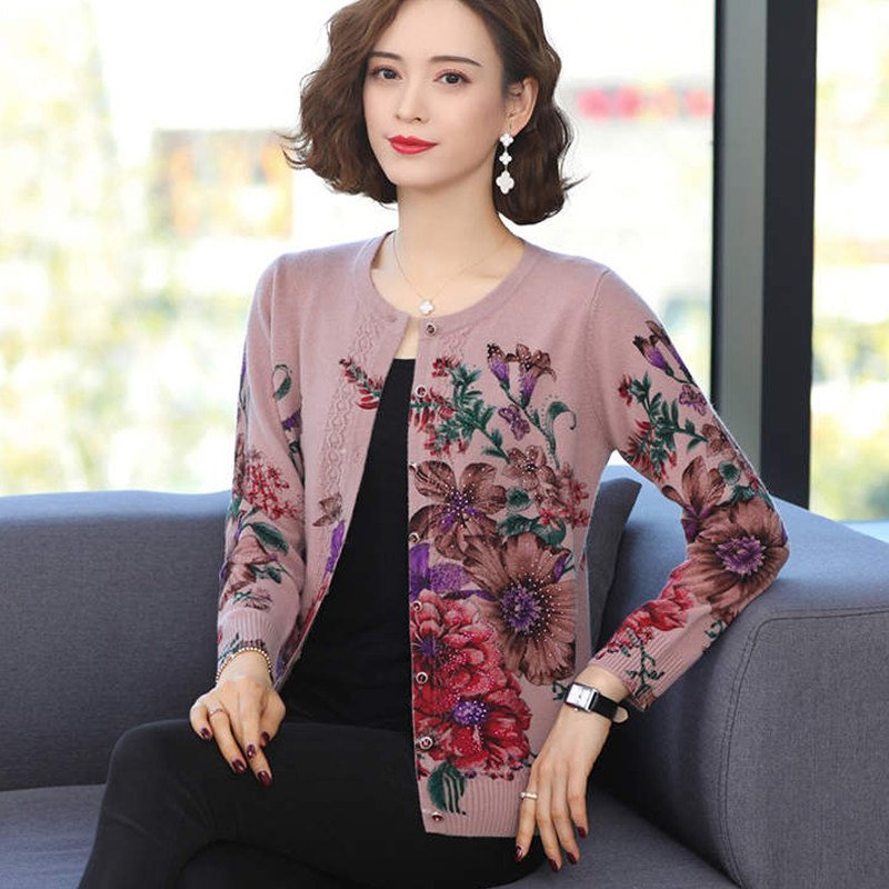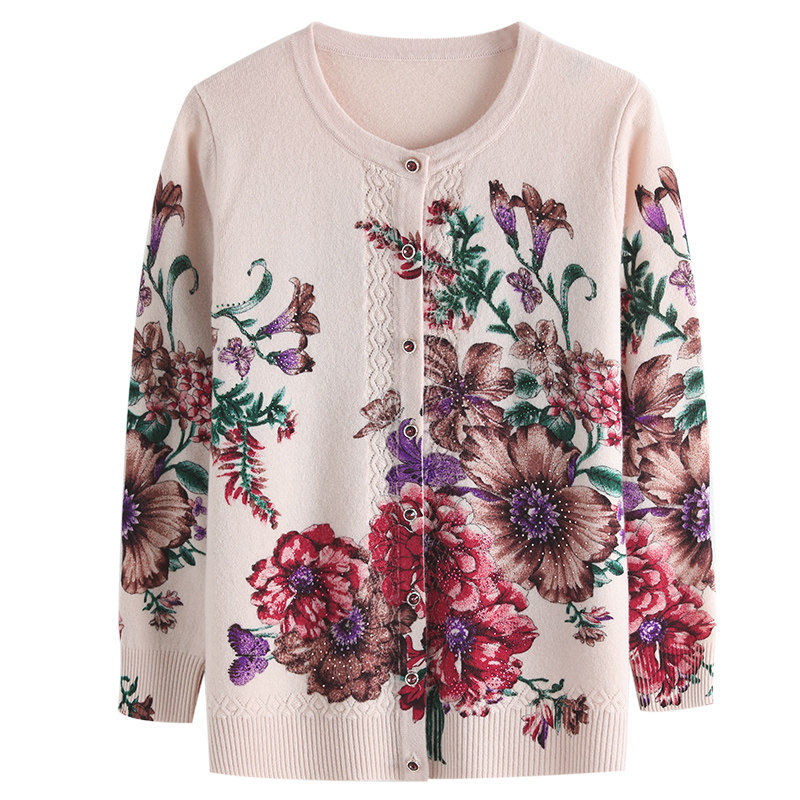 Autumn and winter wool sweater large size sweater women loose middle-aged mother wear cardigan thin coat printed cashmere sweater