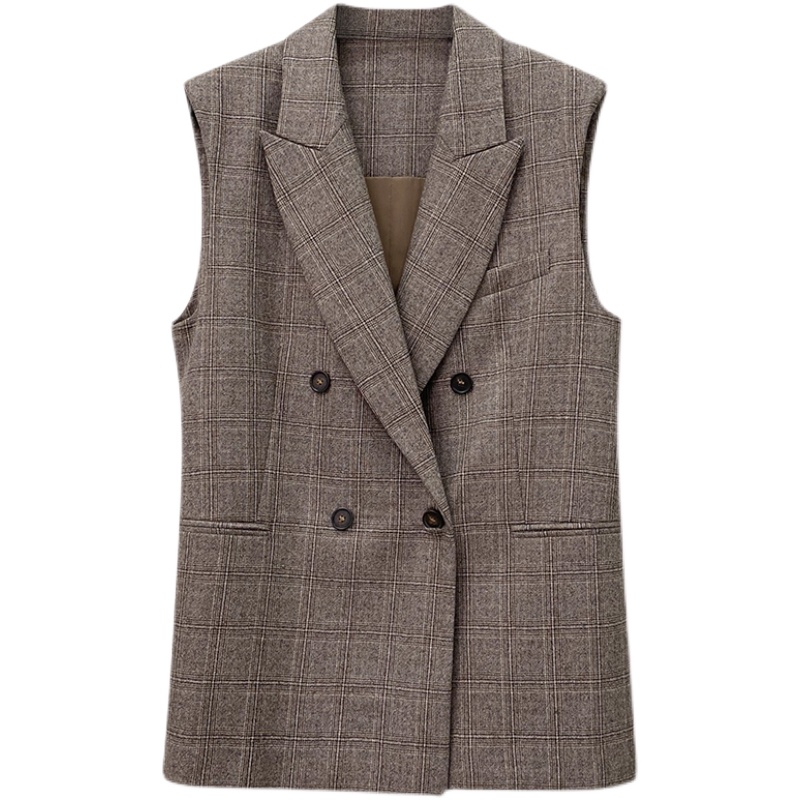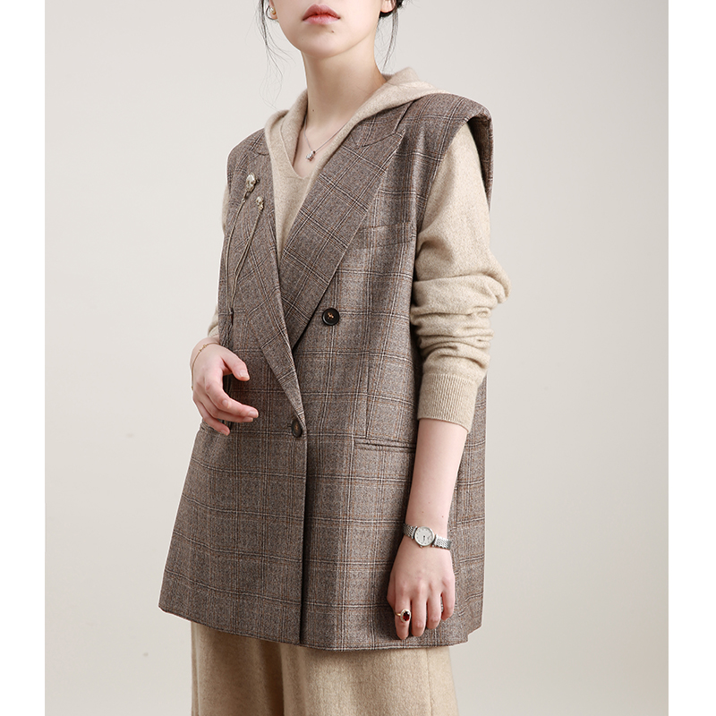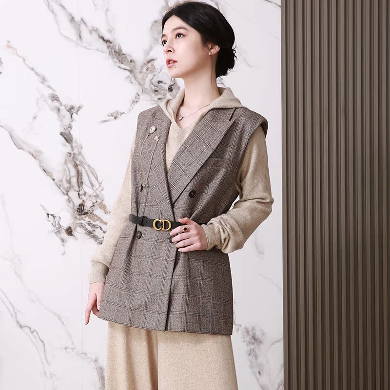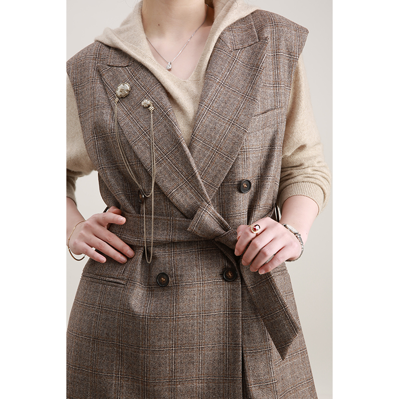 NZ Inléon wind double-row buckle lacing to collect waist retro camel-coloured wool plaid suit women's waistcoat 2021 autumn