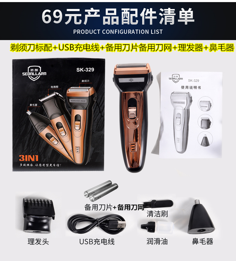 Big power three-in-one reciprocating electric shave knife rechargeable scraping beard cutter head shaved hob
