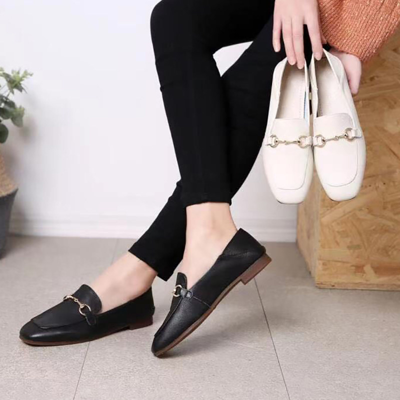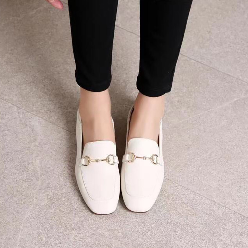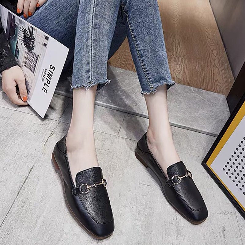 Horsebit loafers women's summer one pedal beef tendon bottom soft bottom fairy shoes gentle square toe flat shoes women's genuine leather