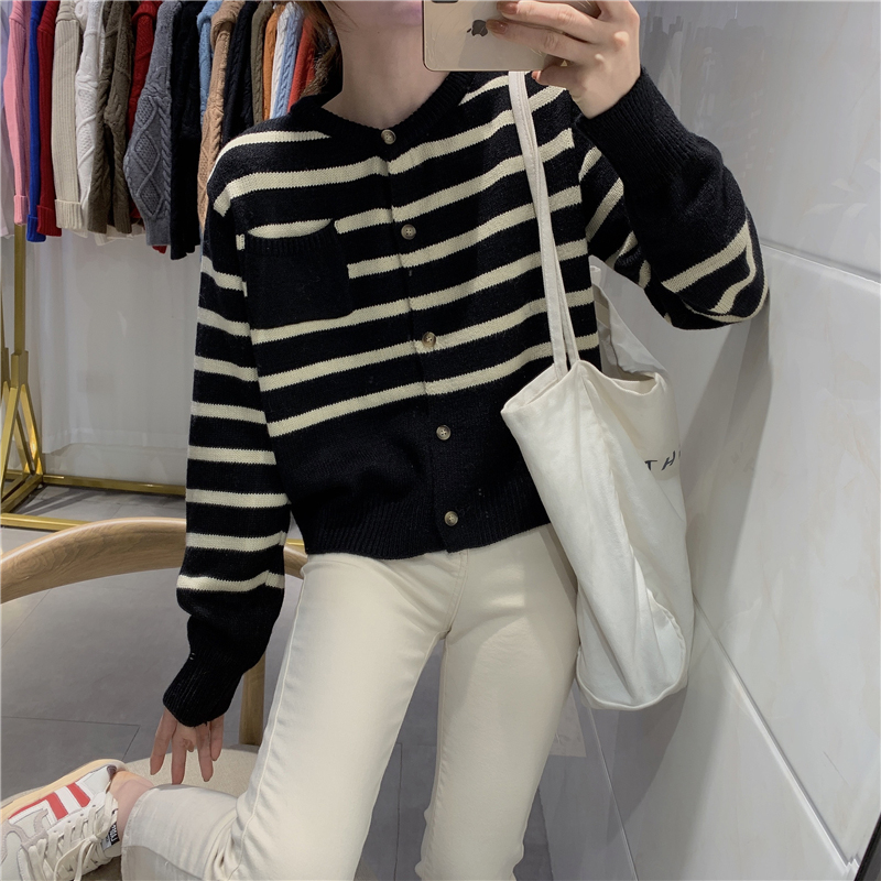 Literature and art round collar Spring loaded knit Korean version loose display slim fit and slimmer jacket striped jacket striped shorts for women-Taobao