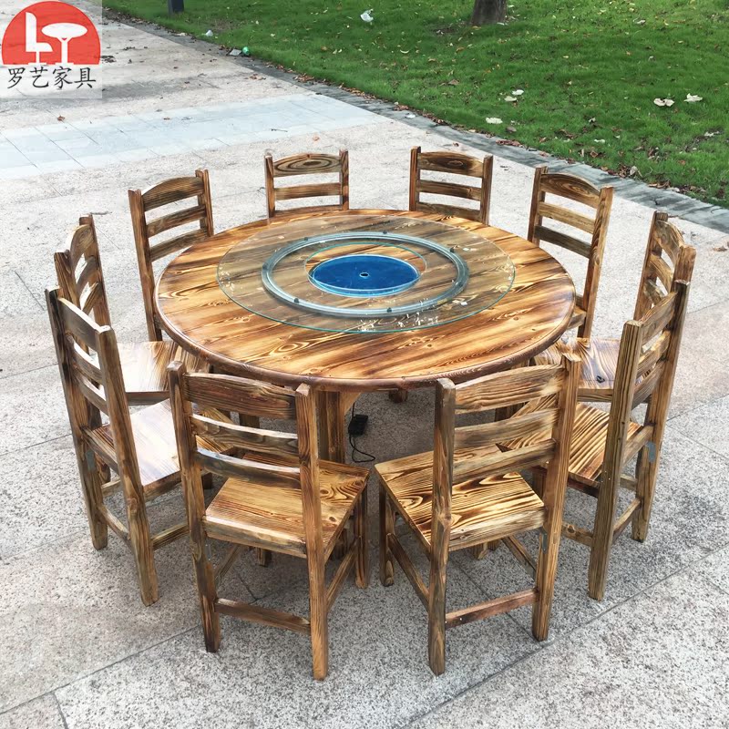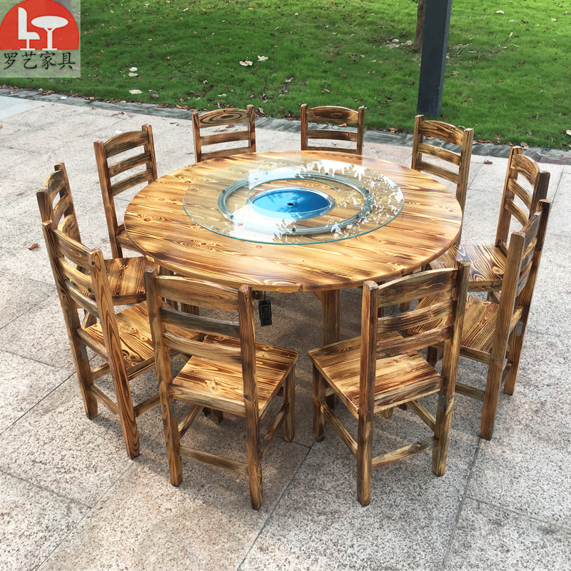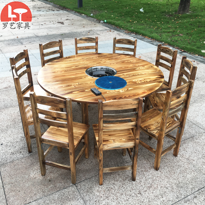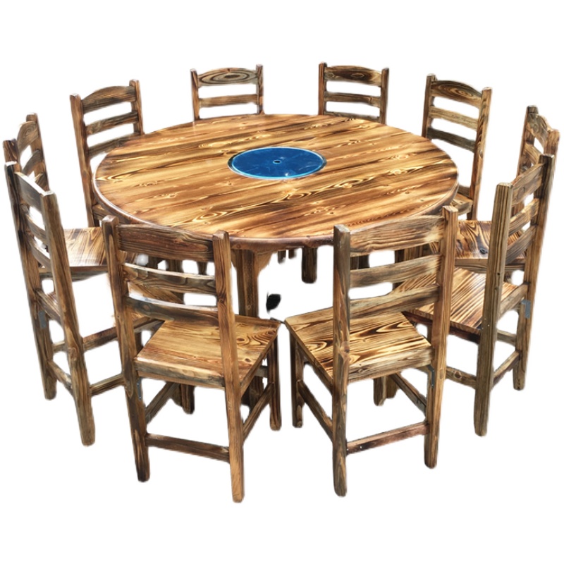 Solid wood hot pot table induction cooker one restaurant round table leisure farm dining room carbonization round table barbecue table charcoal stove table