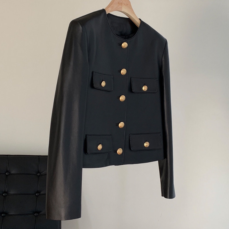 Imported Sheep Leather Leather Leather Clothing Jacket Woman Round Collar Retro Gold Buckle Small Fragrant Wind Short leather jacket 2021 new