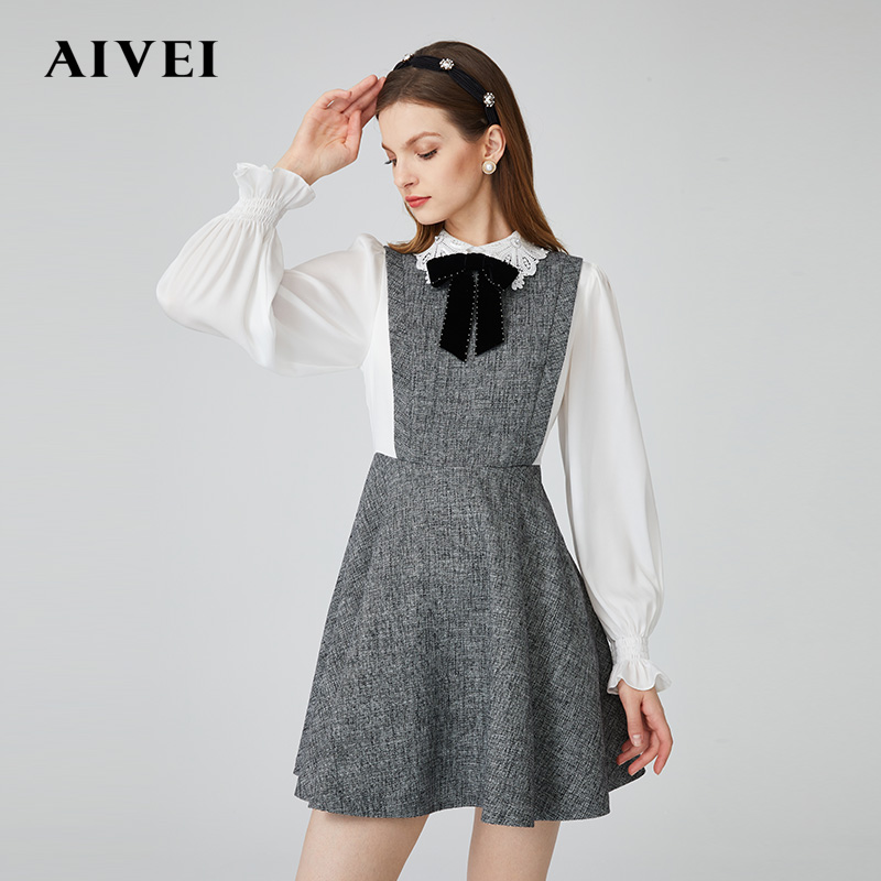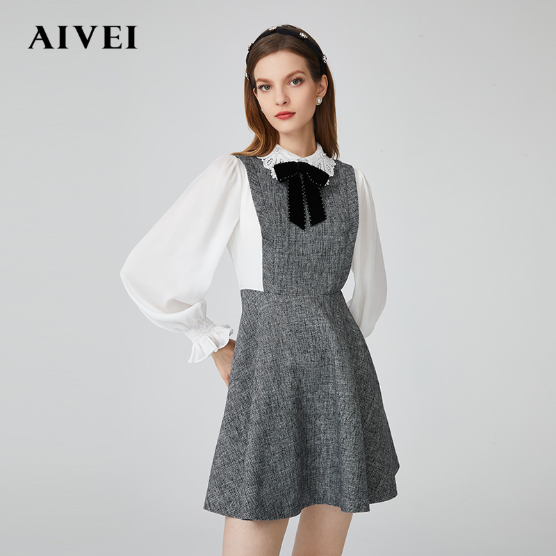 AIVEI Hingga Ai Wei 2022 Spring New College Wind Embroidered floral collar snowspun splicing high waist one-piece dress N0660092