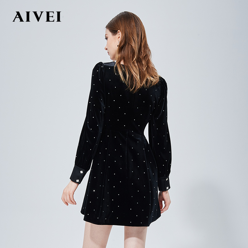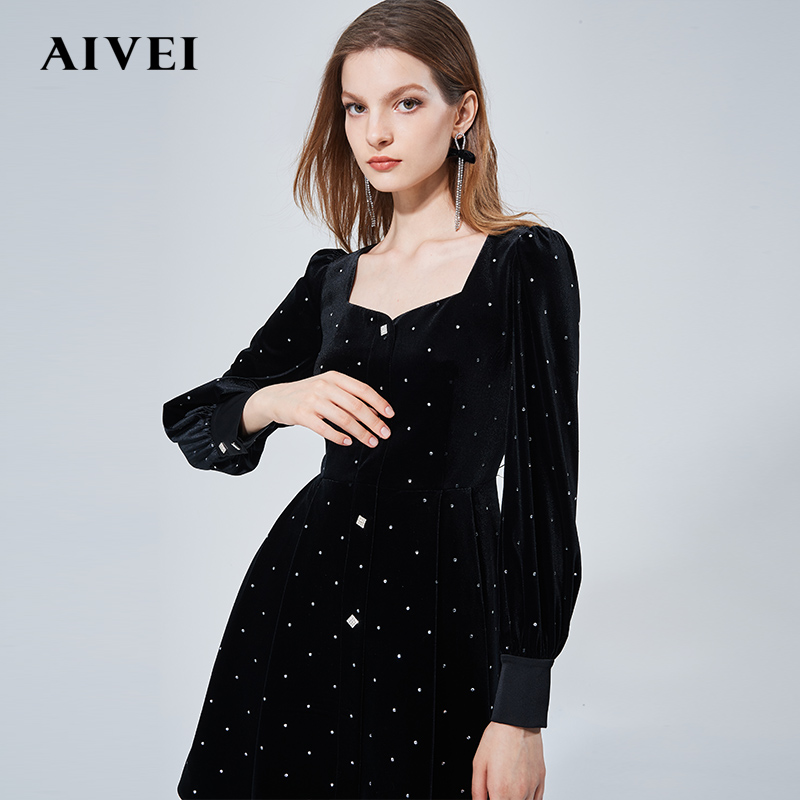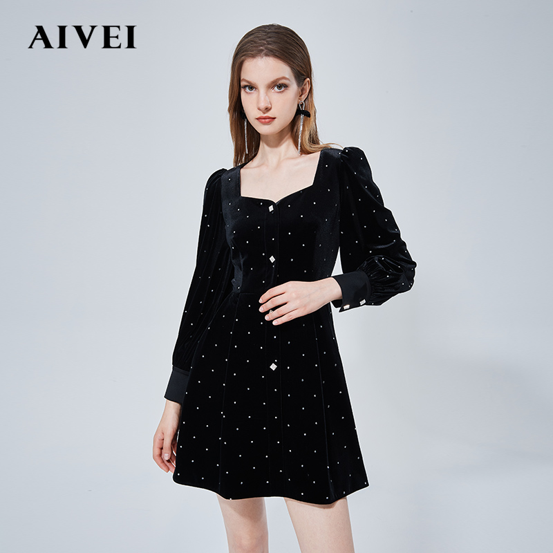 AIVEI Hingga Ai Wei 2022 Spring New Peach Heart collar bronzed to collect waist velvet foreign dress N0660017
