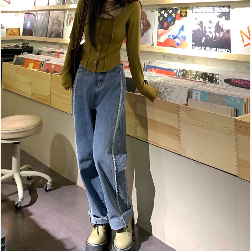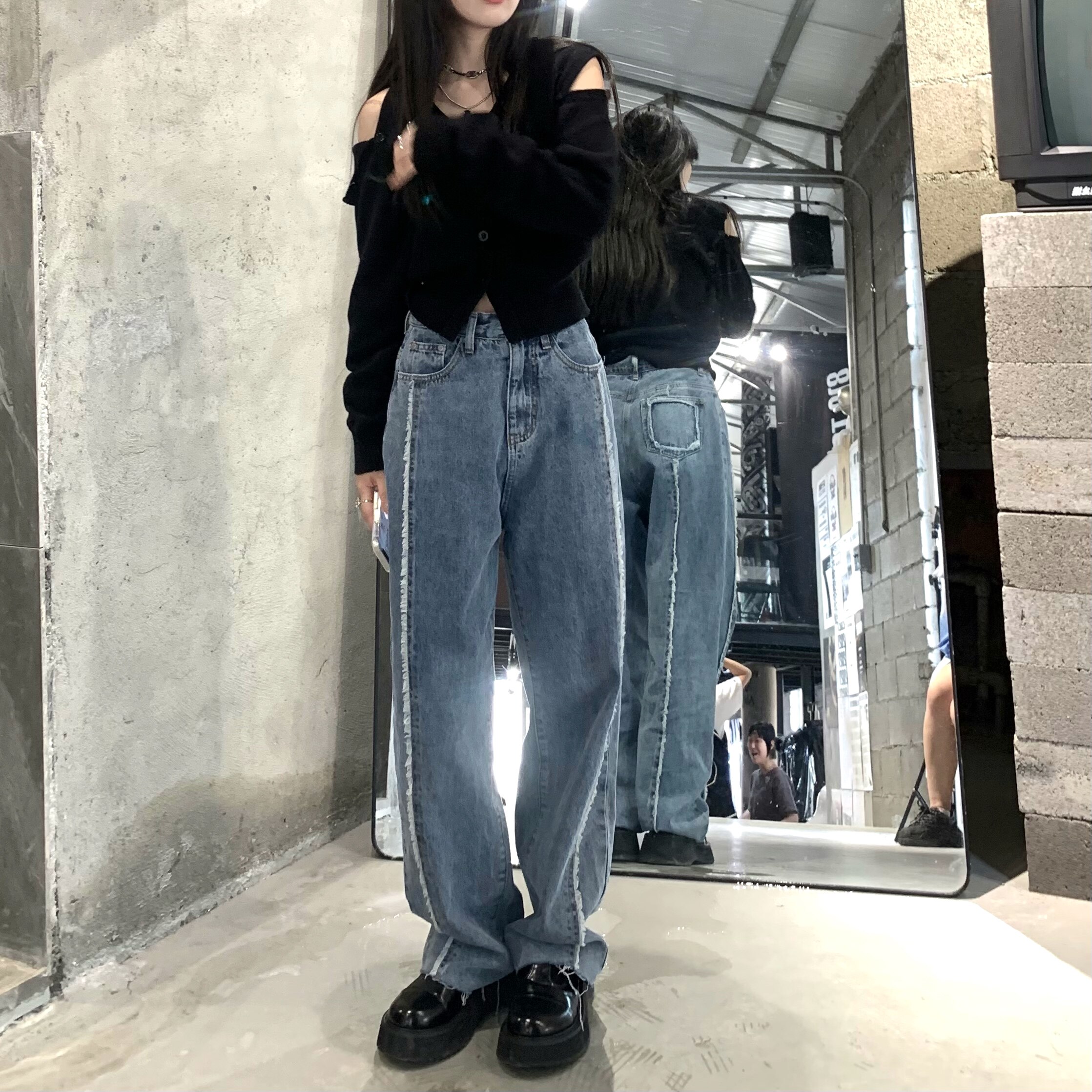 2toyoung easy concave shape Fried street raw edge high waist straight jeans women's casual loose slim trousers