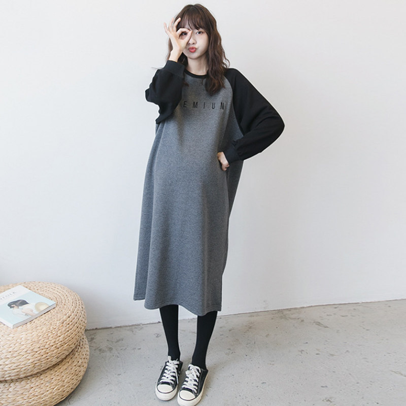 Long version of the pregnant woman's sweatshirt with a knee long sleeve foreign dress Korean version letter embroidered pregnant woman autumn and winter clothing 2021 new