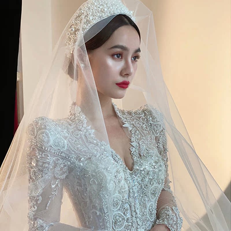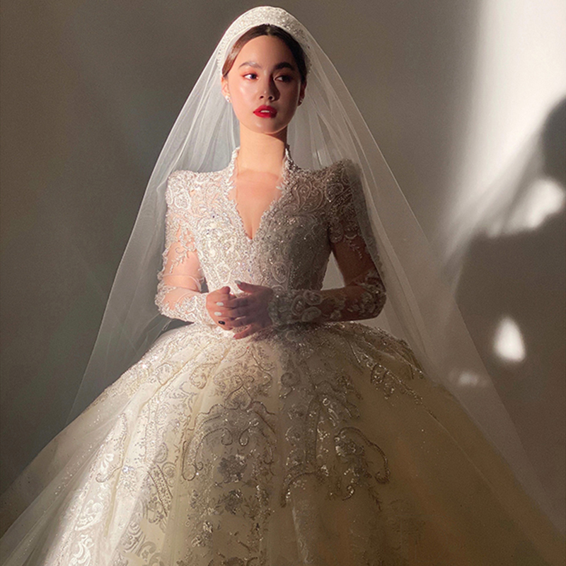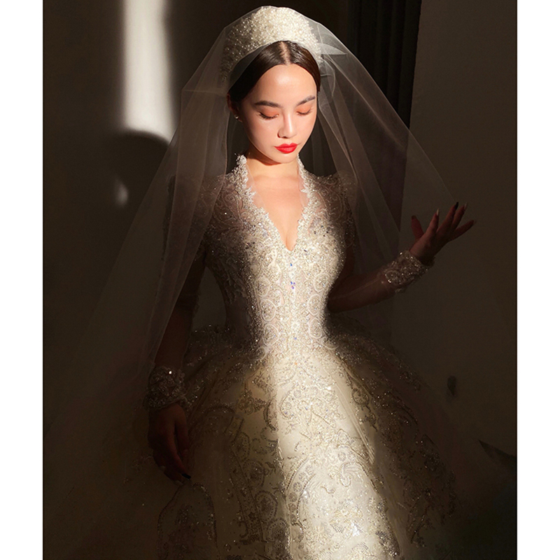 Heavy Industry Bride Main Wedding Dress 2021 New Long Sleeves Court Style V Neck Luxury Retro Trailing Premium Texture Winter