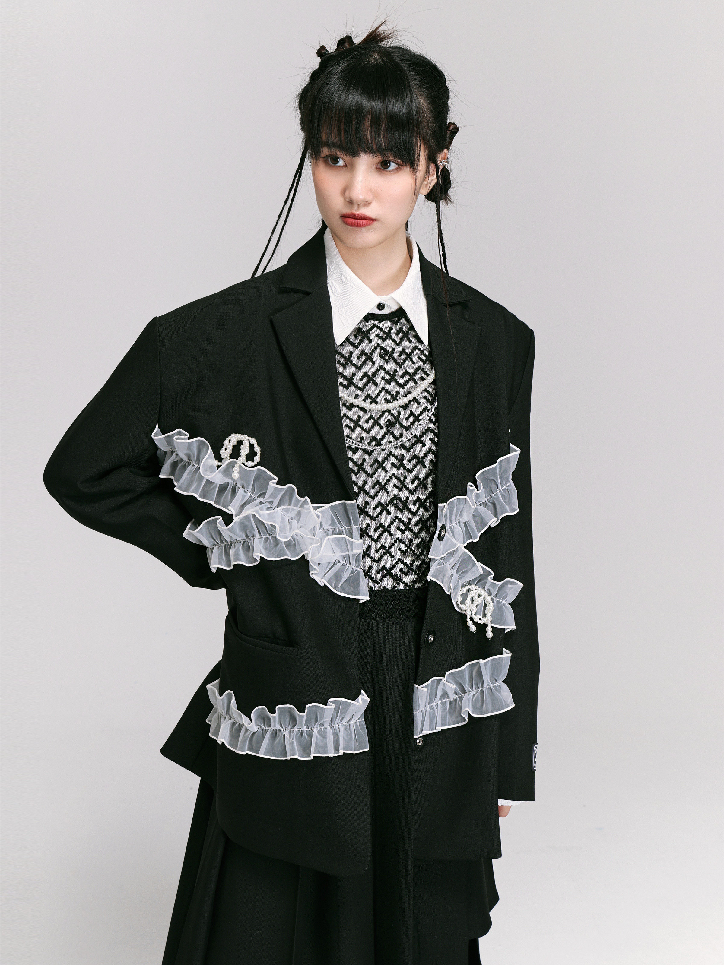 Lace Bow Tie Asymmetry Stitch Mesh Solid Trim Tucked With Tucked Pleats