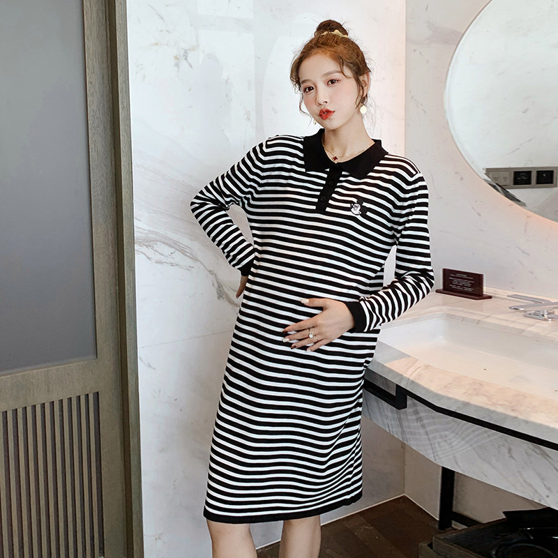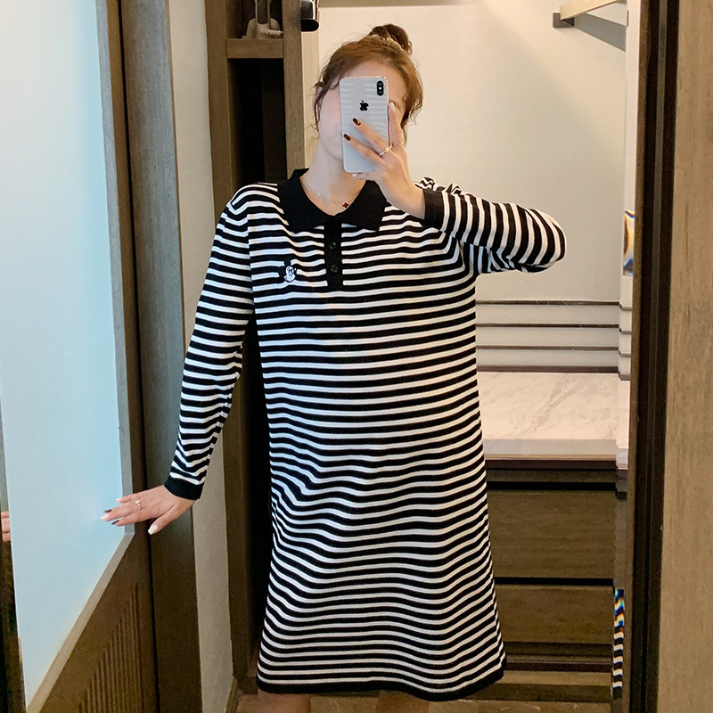 Plus size maternity dress 2022 spring dress loose slim striped sweater trendy mother western style top bottoming skirt