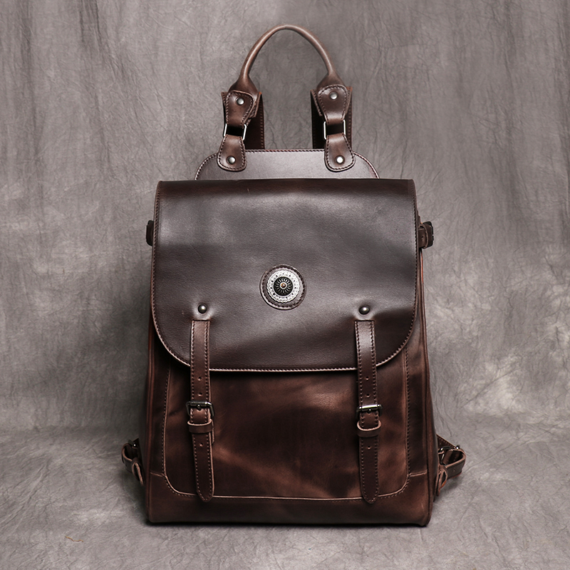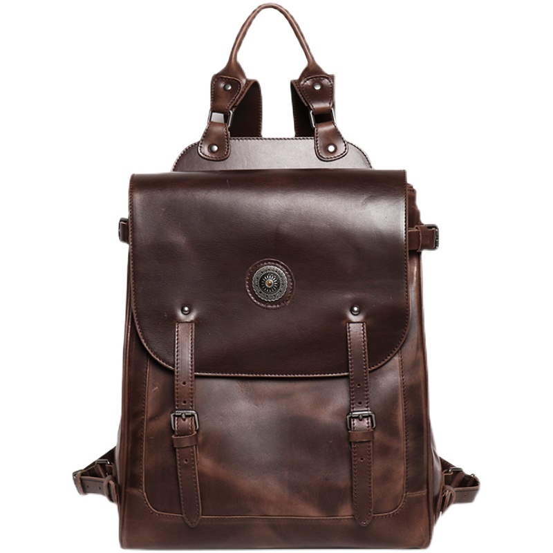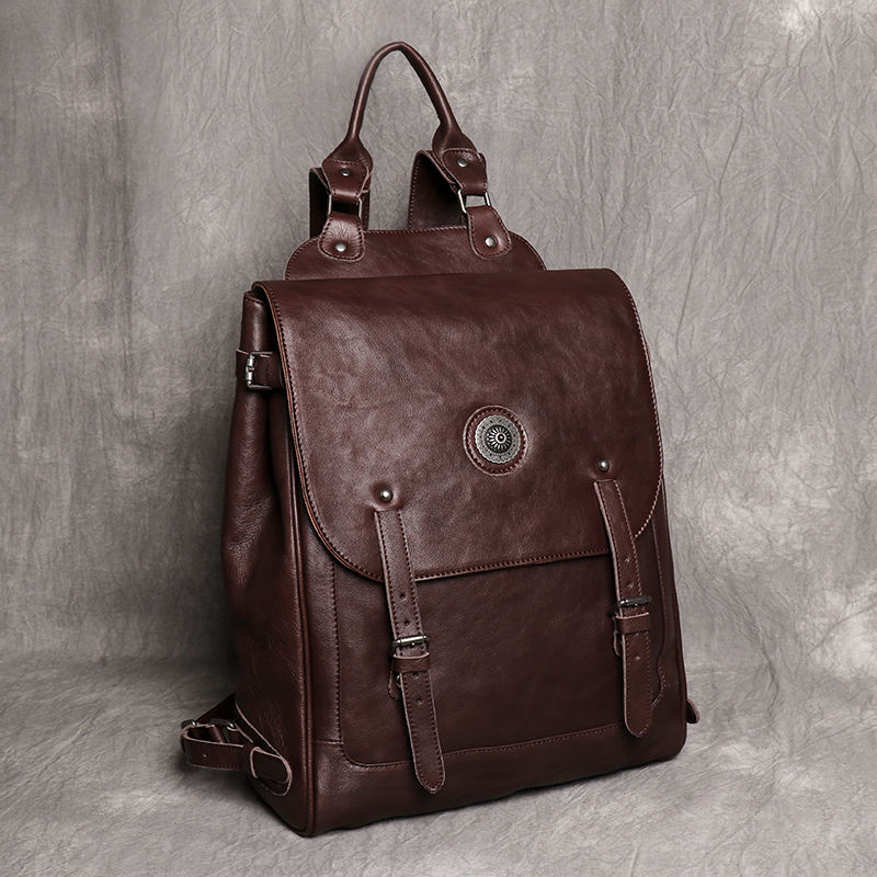 New retro men's backpack solid color vegetable tanned leather computer bag large capacity school bag short-term travel backpack