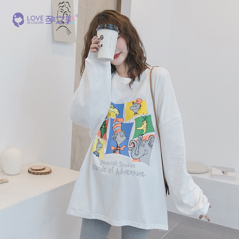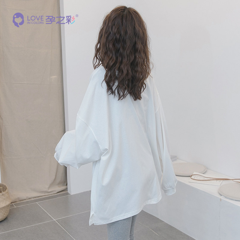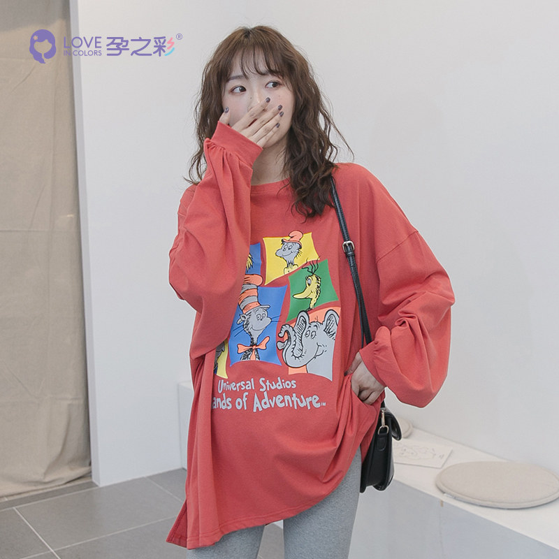 Pregnancy color pregnant woman spring autumn round collar blouse Coloured trend printing medium long version pure cotton long sleeve loose sleeve head casual blouse