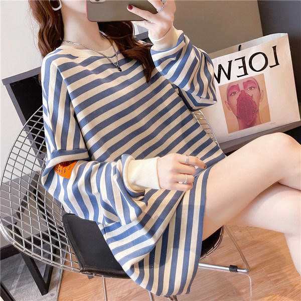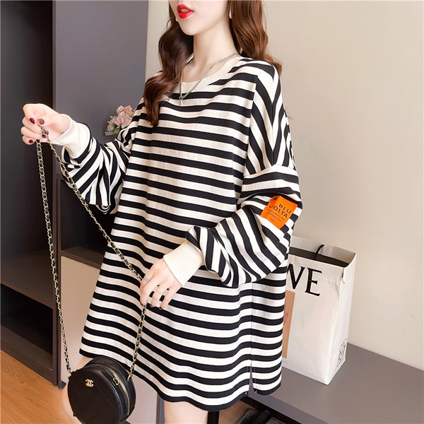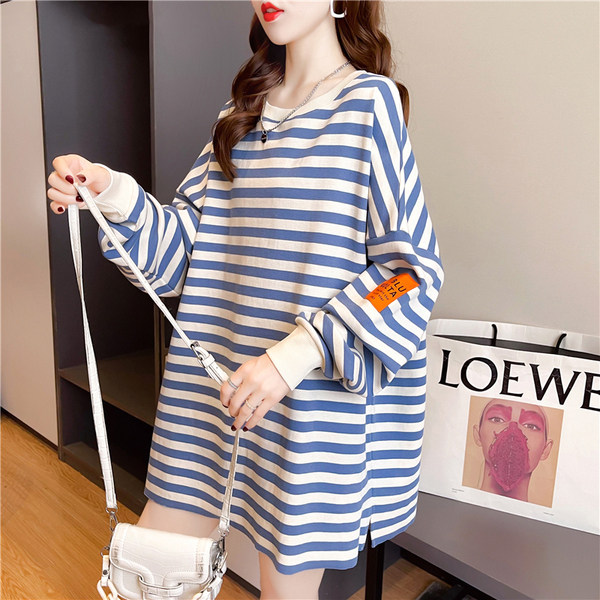 Pregnancy Woman Dress Spring Autumn Slim Sweatshirt Plus Fat Increase Yard Korean version Loose Blouse Striped medium Long version Long sleeves T-shirt 200 catty