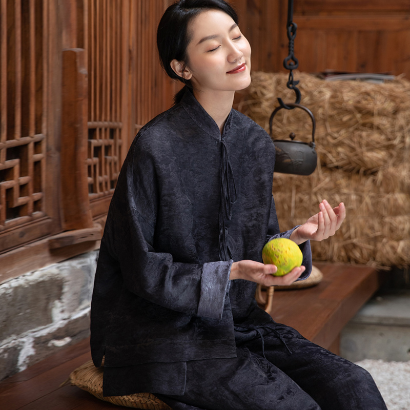 Silk Linen Jacquard Satin Autumn Chinese Retro Modified Tang Suit Lace-Up Outline Loose Blouse Pants Set