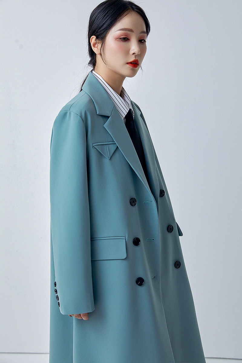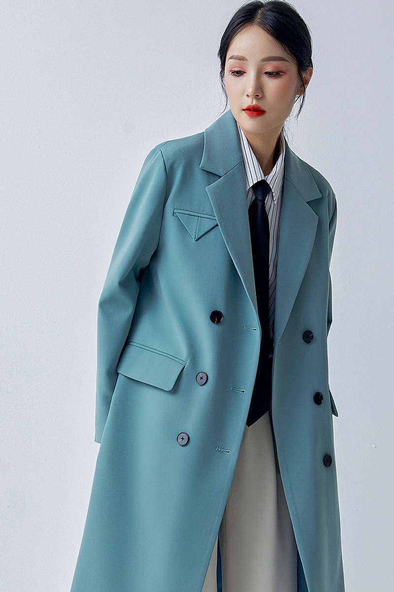 Blue-green suit collar windbreaker women's 2022 spring and autumn new style this year's popular Korean version loose coat mid-length coat