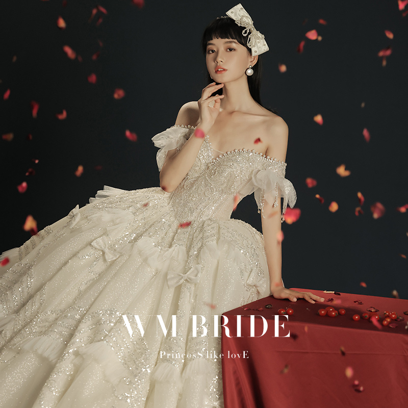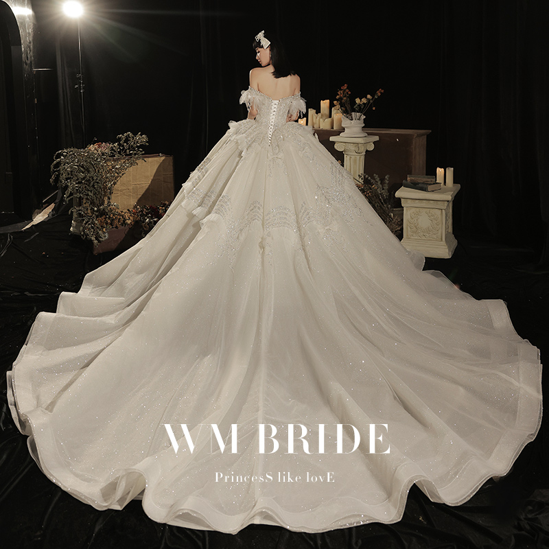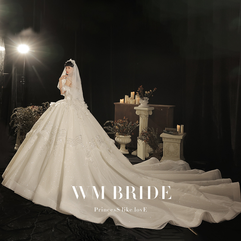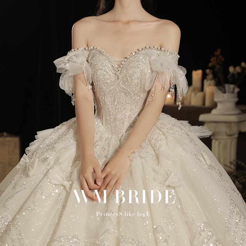 Wedding dress 2022 new bride one word shoulder long trailing high-end texture light luxury temperament high-end heavy industry Korean style high-definition