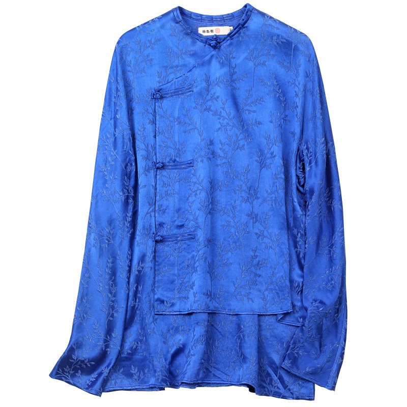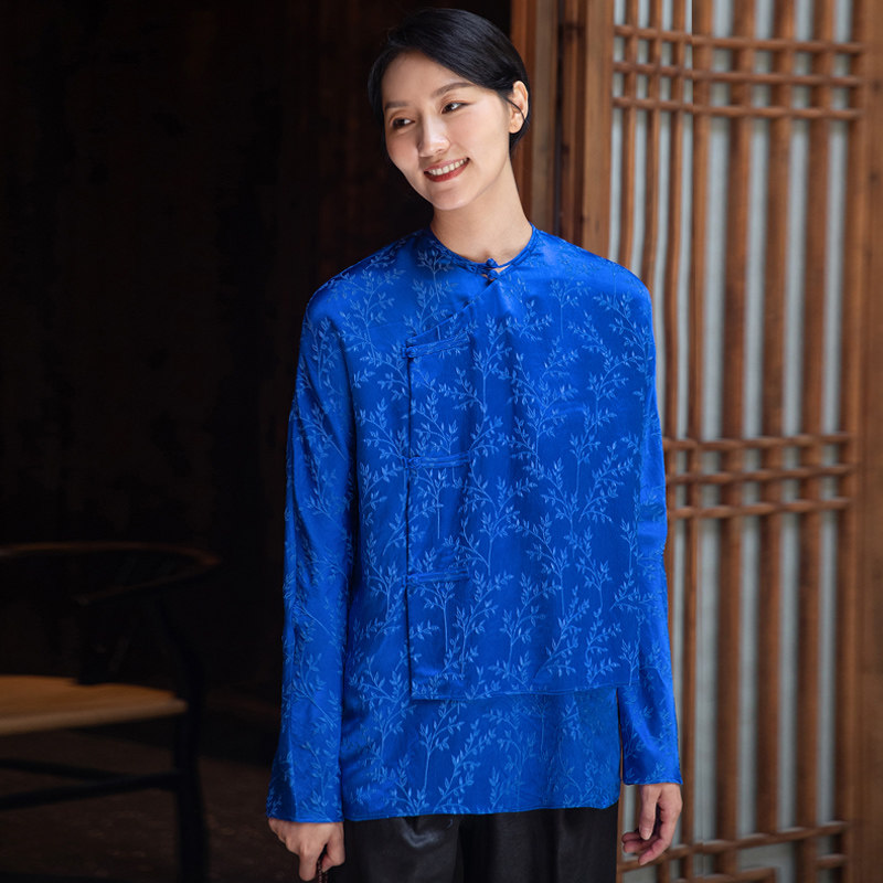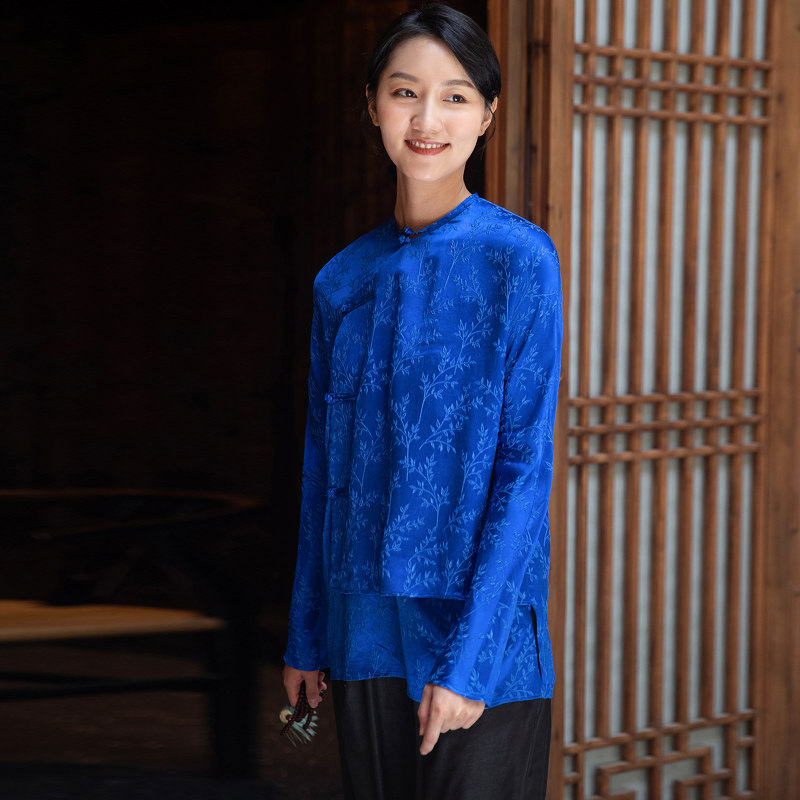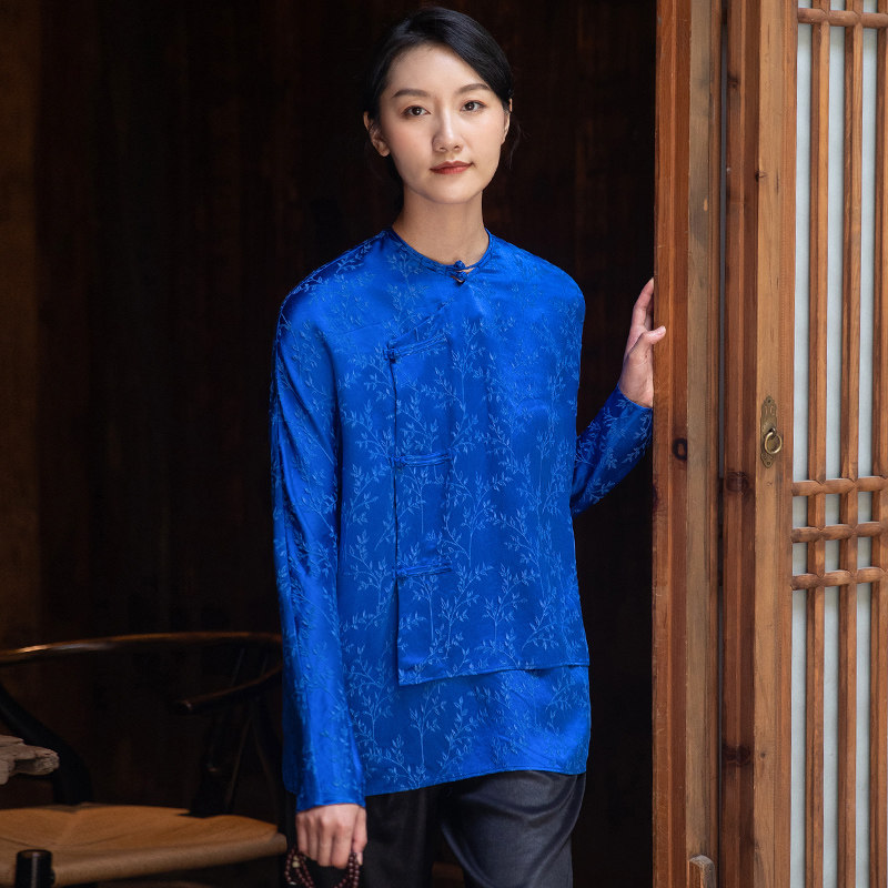 New Chinese Art Retro Refined China Wind Real Silk Blend Jacquard satin diagonal flap round collar shirt Down with female blouse