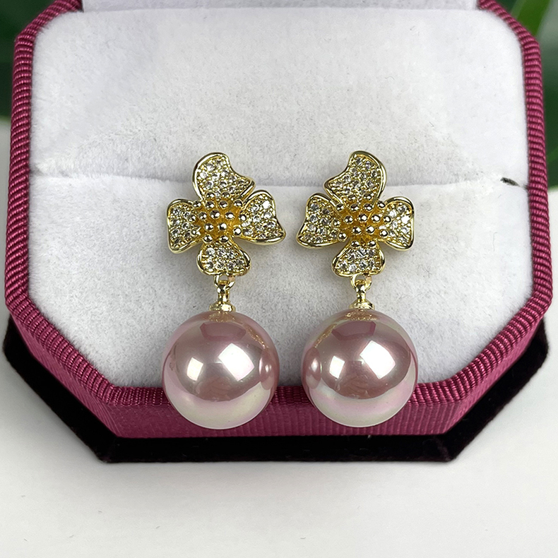 Flower stamen S925 silver inlaid diamond shell bead earrings natural mother-of-pearl imitation pearl earrings decorated with white and purple